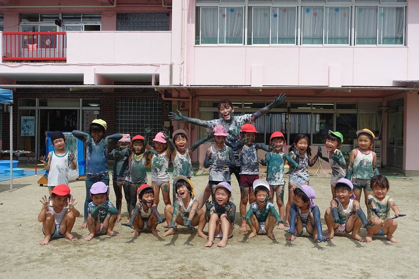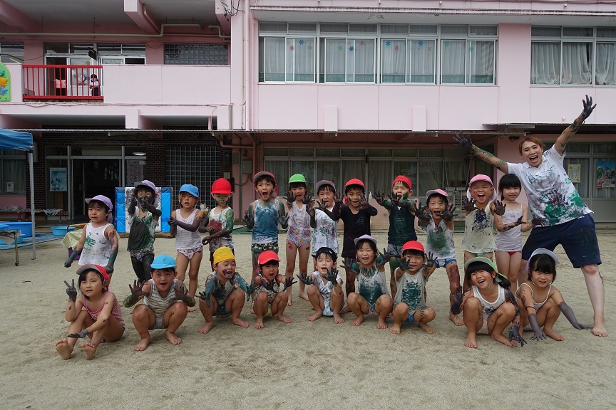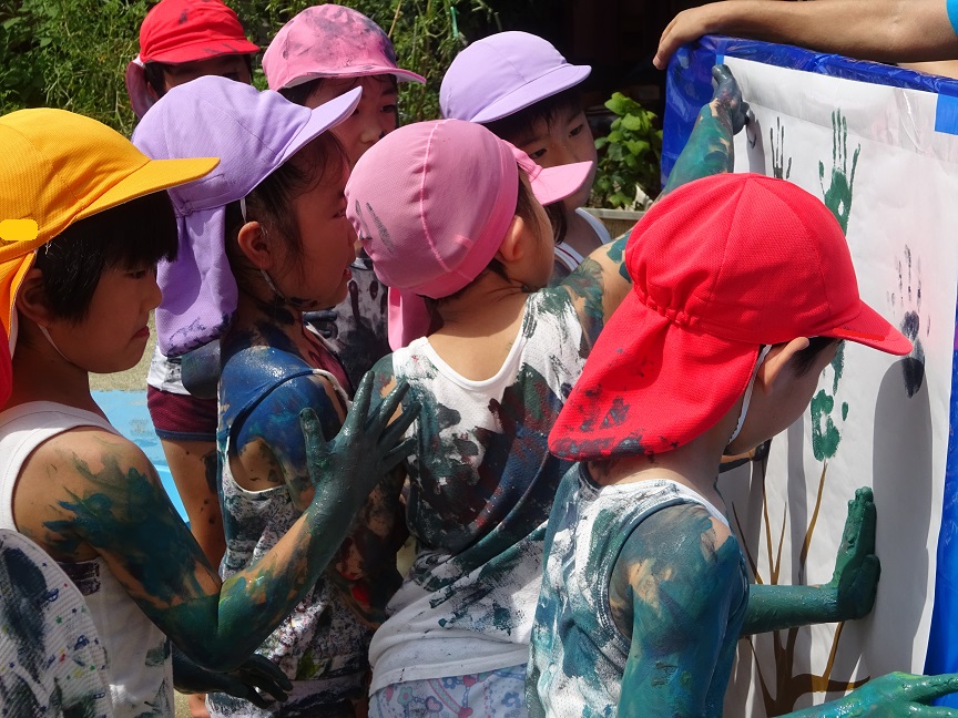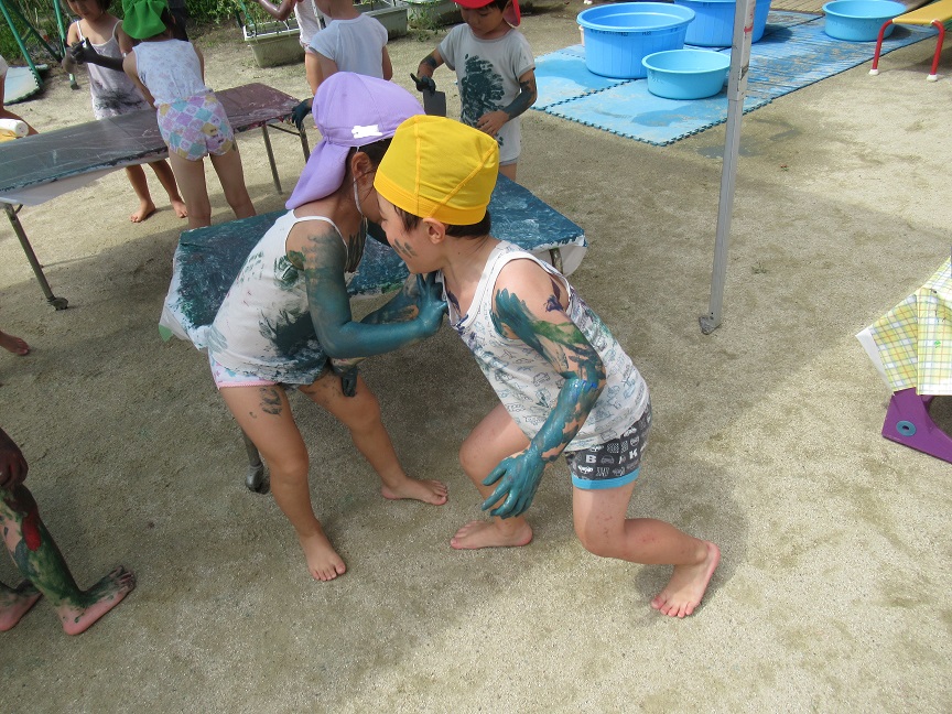 「いろんな色を混ぜる!!」「絵の具星人になるぞ!」と楽しみにしていた子どもたち。絵の具を両手を使って混ぜたり、友達と全身につけ合いっこをしたりしてダイナミックに遊ぶことができました☆友達同士見合って、体いっぱい絵の具だらけになった姿に、笑い合っている子もいました♡
