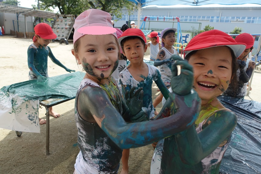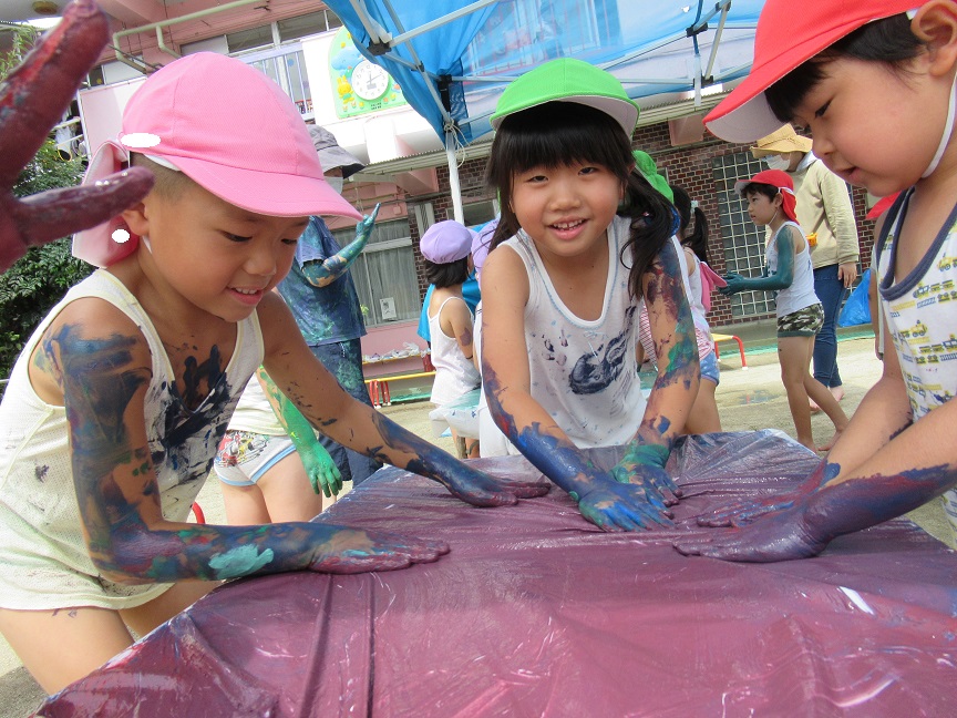 最初は絵の具を触ることに抵抗があった子も、絵の具いっぱいの机に指先で絵を描いたり、先生や友達の顔に落書きしたりして徐々に慣れていく姿がありました♪