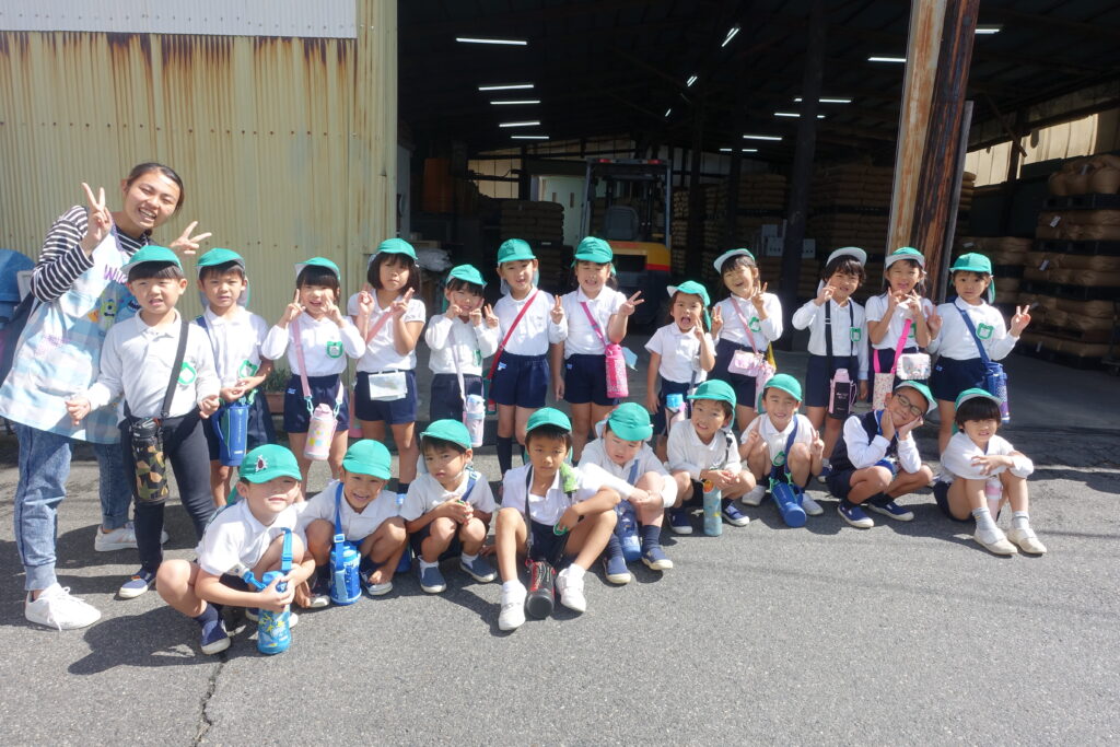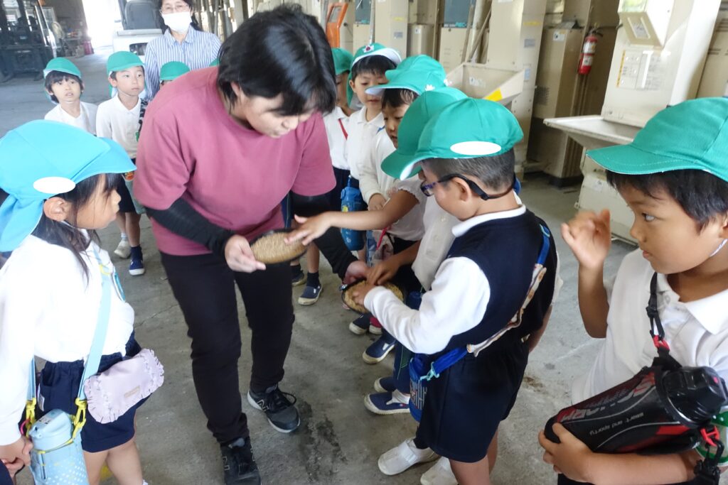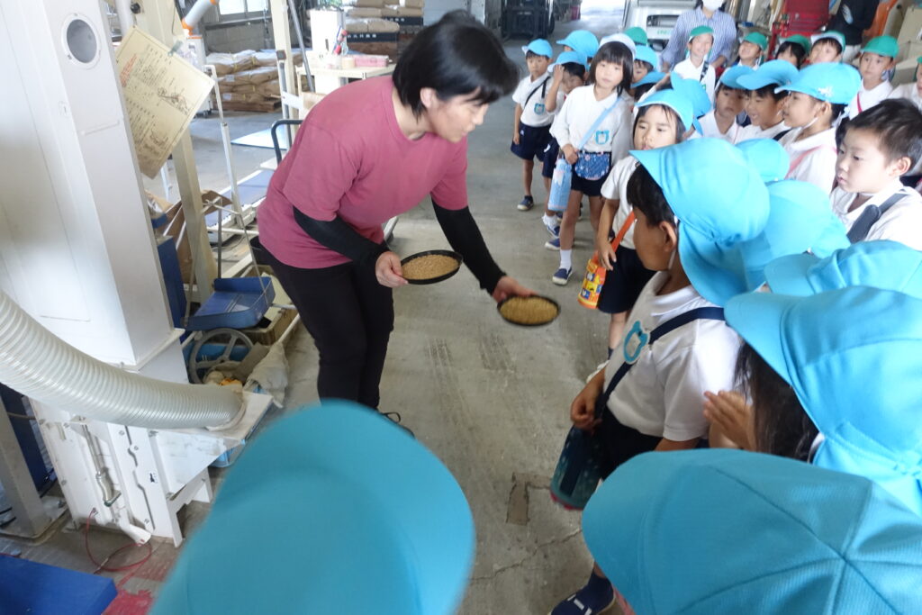 5月に田植え・9月に稲刈りを経験した年長さん。今日は収穫したお米がどのようにして食べられるお米になるのか、小久井農場さんへ見学に行きました。