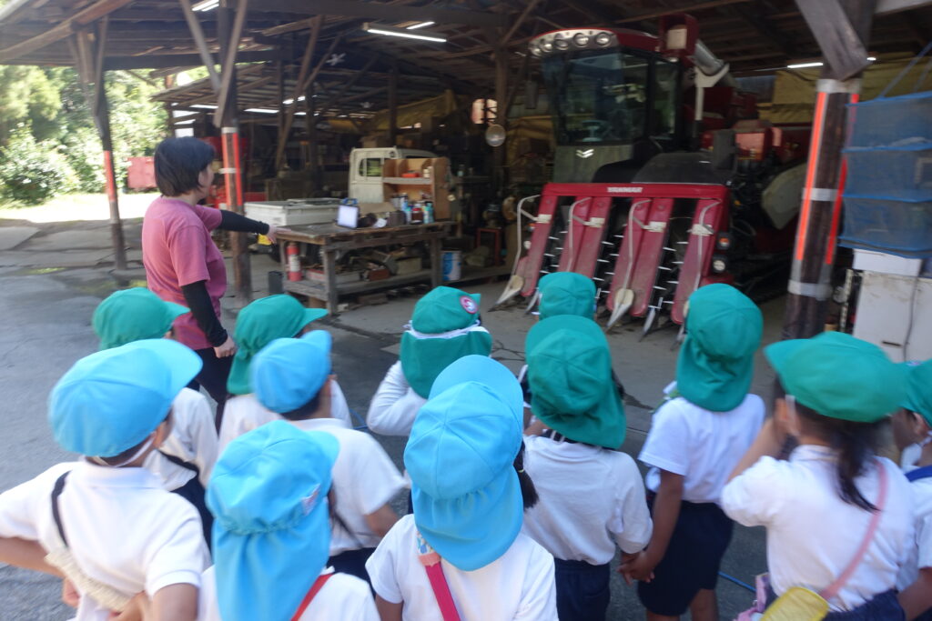 まず、大きな機械の迫力にびっくり!それぞれの機械に、乾燥させる役割や、もみ殻を剥く役割などがあることを知りました。また、稲刈りをするときに使うコンバインや、トラクターも間近で見せてもらい、「前に鎌がたくさんついてる!」「タイヤすごい大きいね!」とたくさんの発見もすることができました♫