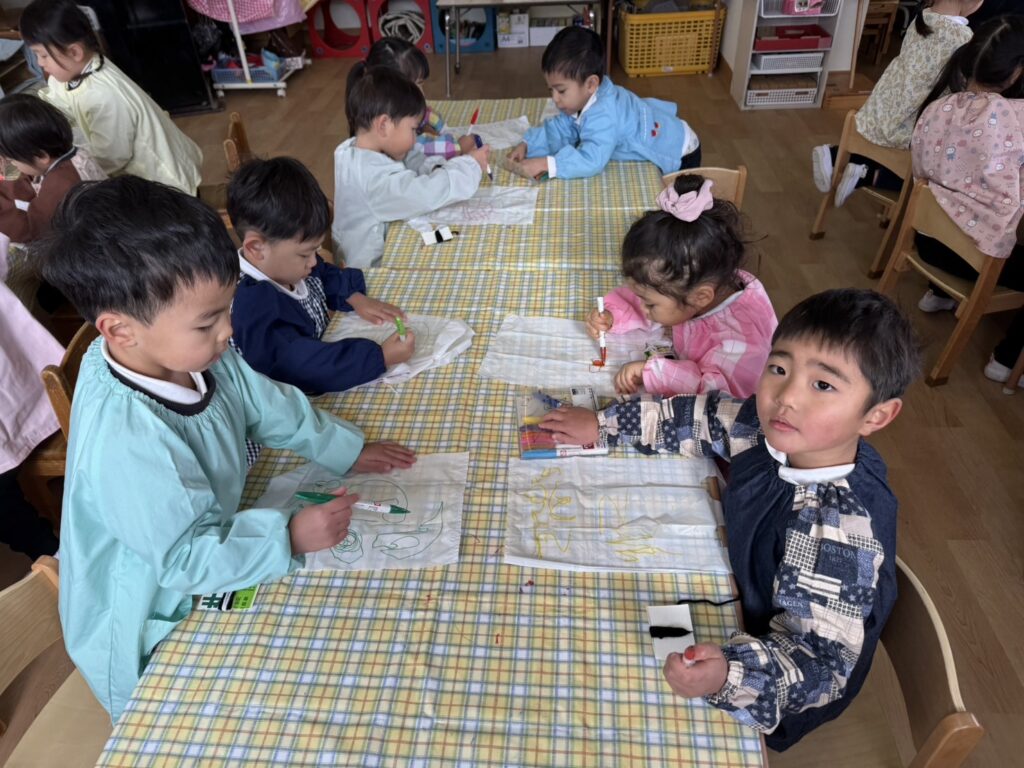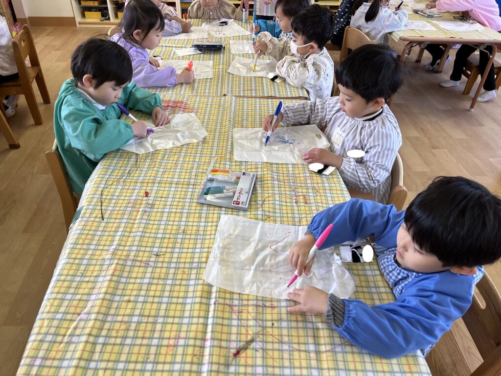 うさぎ組・ねこ組は、ビニール袋に油性ペンで好きな絵を描いて凧作りをしました。