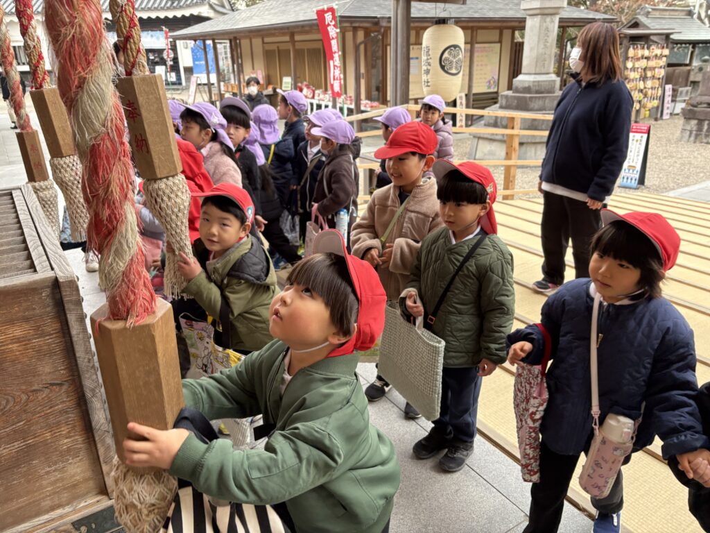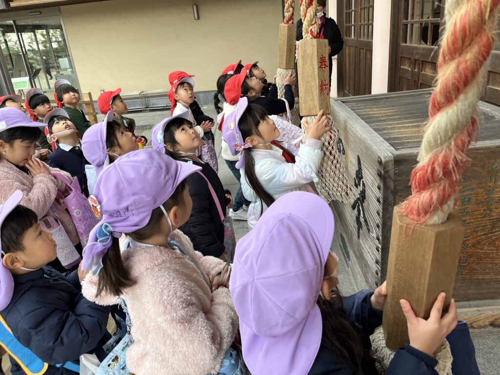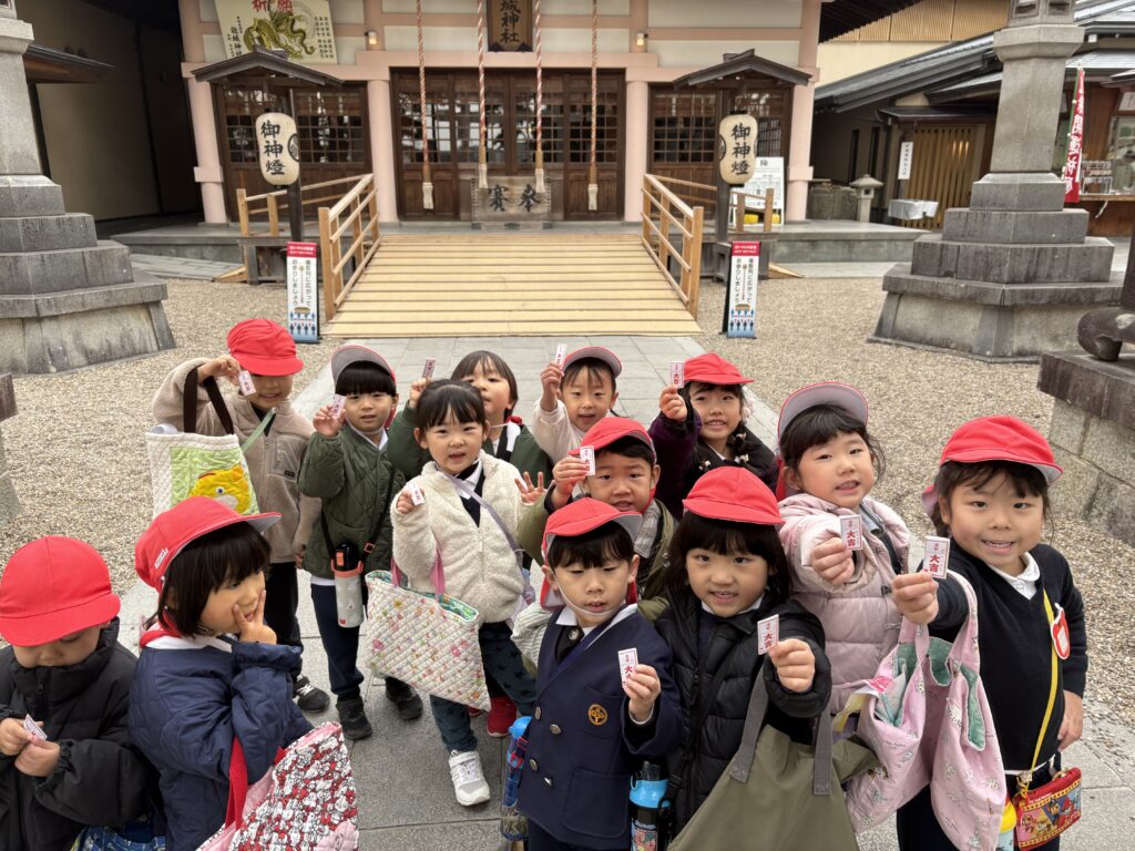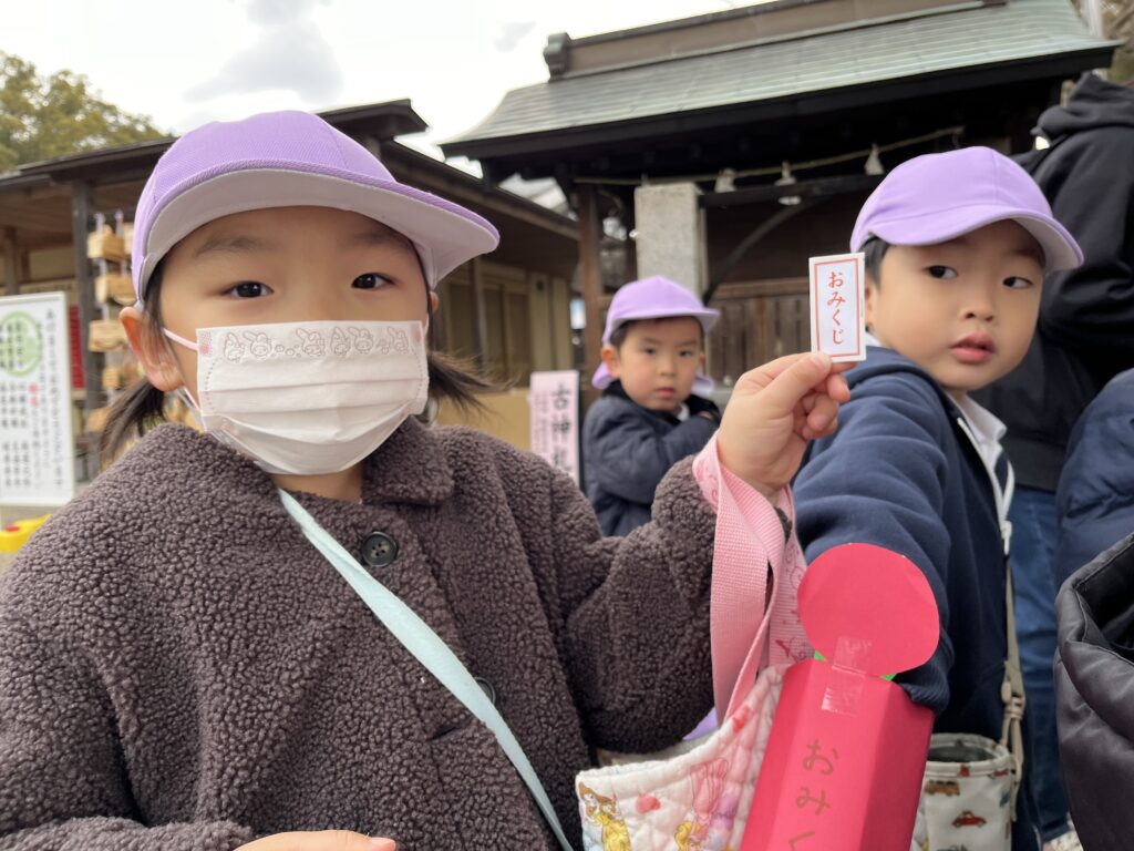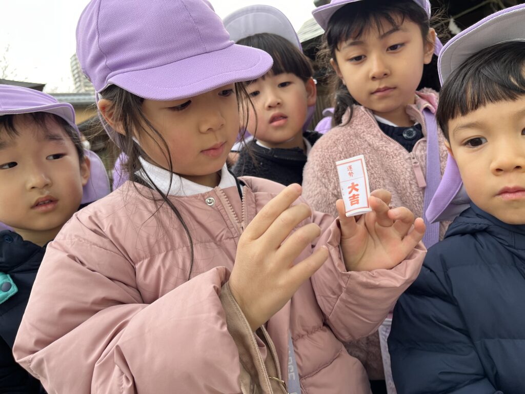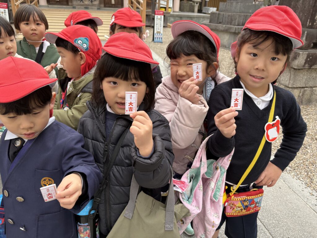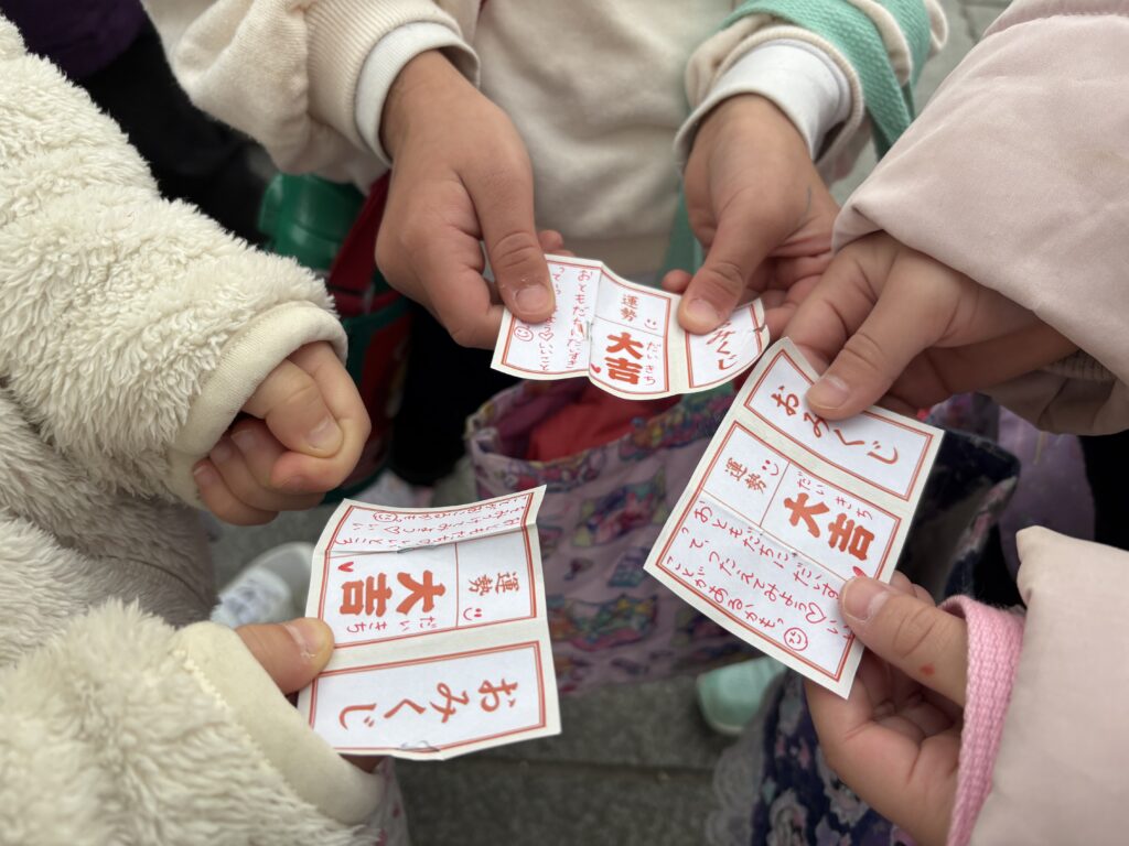 その後は、初詣に行きました!感謝の気持ちを伝えたり、お願い事をしたりとそれぞれお参りをしました(^^♪先生たちが作ったおみくじを引きました!「大吉だ!」「いいことが起こるかも、、、♡だって!」など自分で字を読む子もいました☆