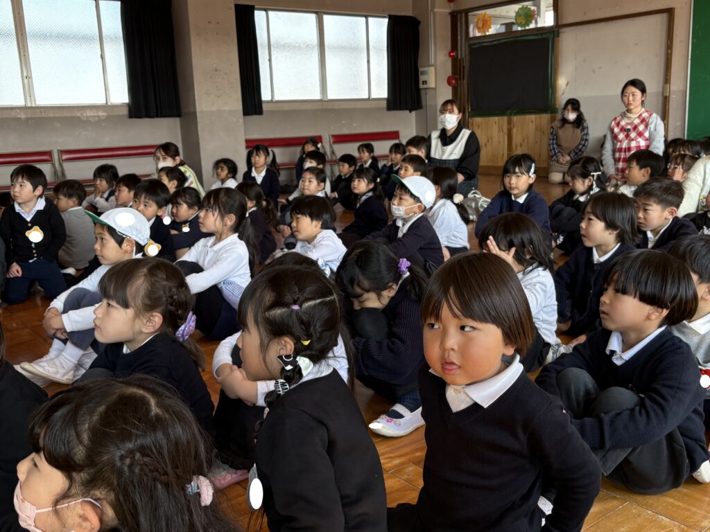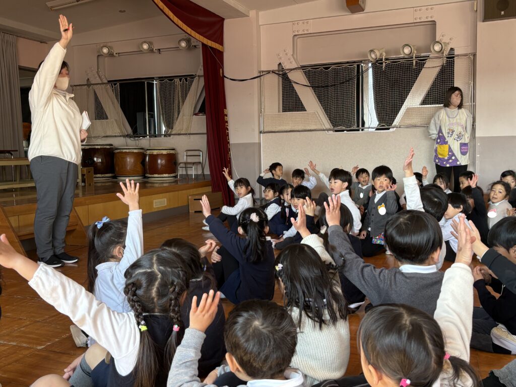 「もし川の水が溢れて、幼稚園まで水がたくさん流れてきたらどうする?」と子どもたちに問いかけると、「高いところに逃げた方が良さそうだね」「幼稚園は、3階が一番高い場所だね」と考える姿がありました。訓練の放送を聞いて、3階ホールまで全員が落ち着いて避難することができました。