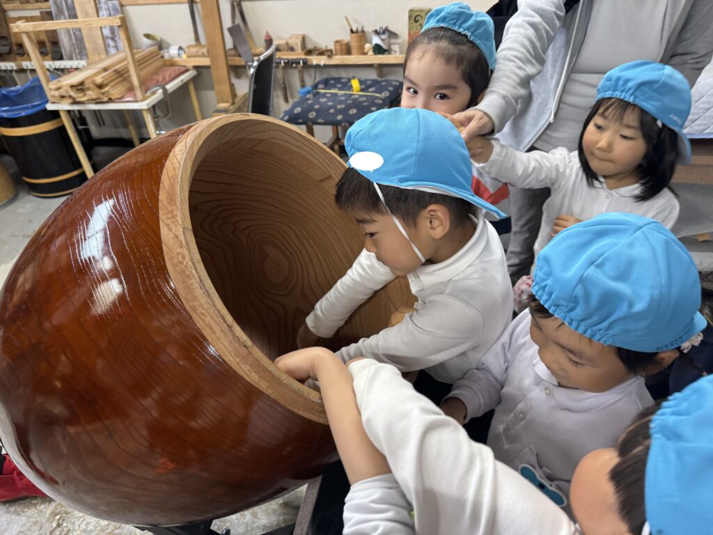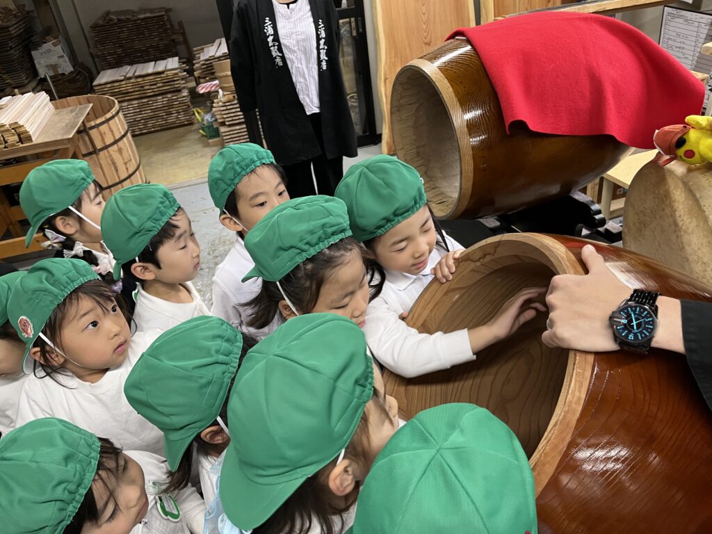 今日は、年長組で三浦太鼓店さんへ行き、和太鼓の作り方を職人さんから教えていただきました。