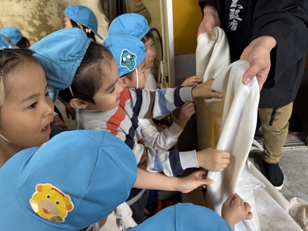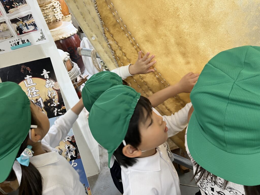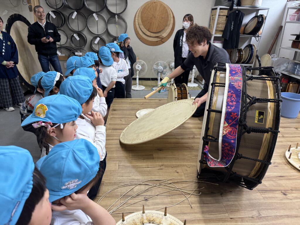 「和太鼓の面は、何の皮で作られているでしょうか?」「太鼓の中には何が入っているでしょうか?」などクイズに答えながら、実際に作っている職人さんの話を聞いたり、実物を見て触ったりしながら学ぶことができました🌟