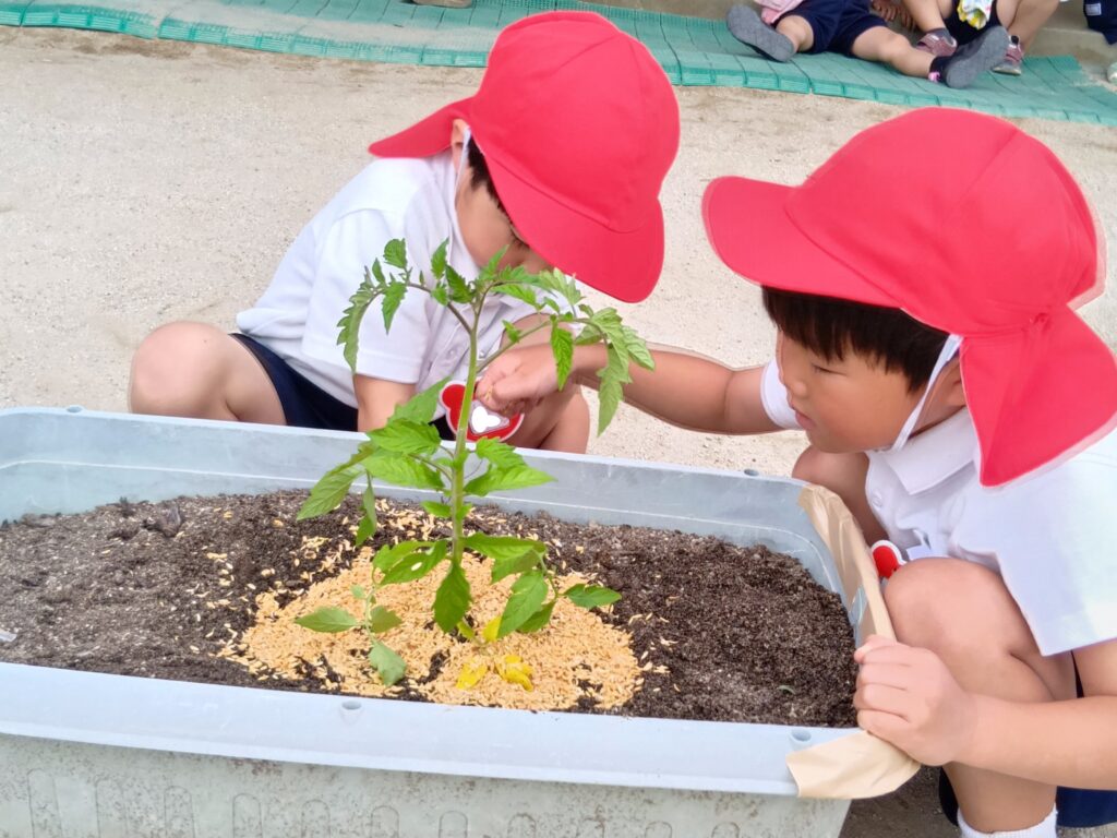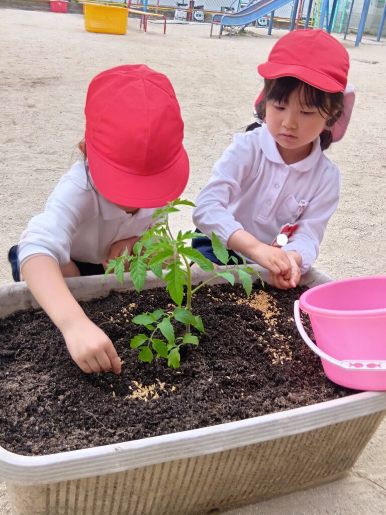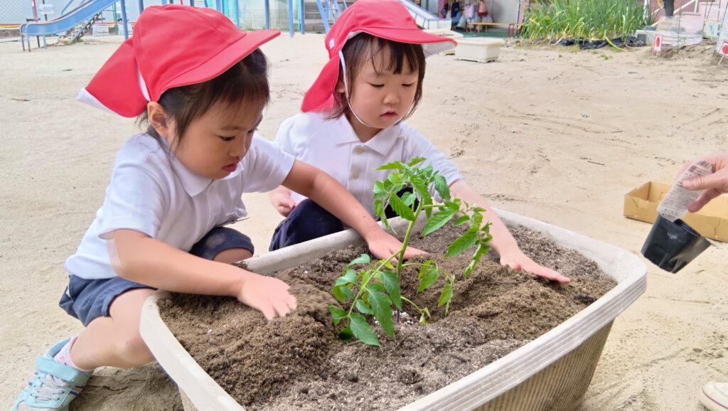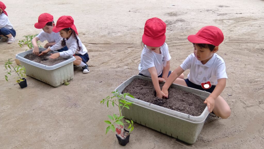植える工程を分担し、苗に優しく土を被せたり、苗の周りにもみ殻をかけたり、水をあげたりして、みんなで育てることに期待をもつ姿がありました😊