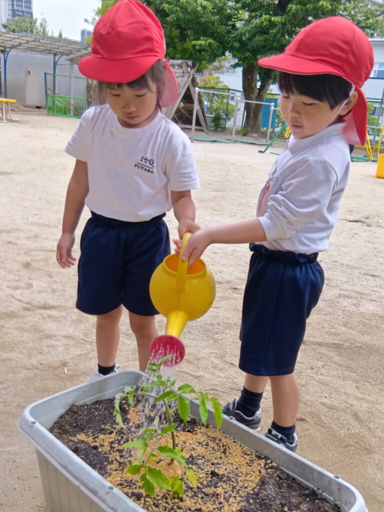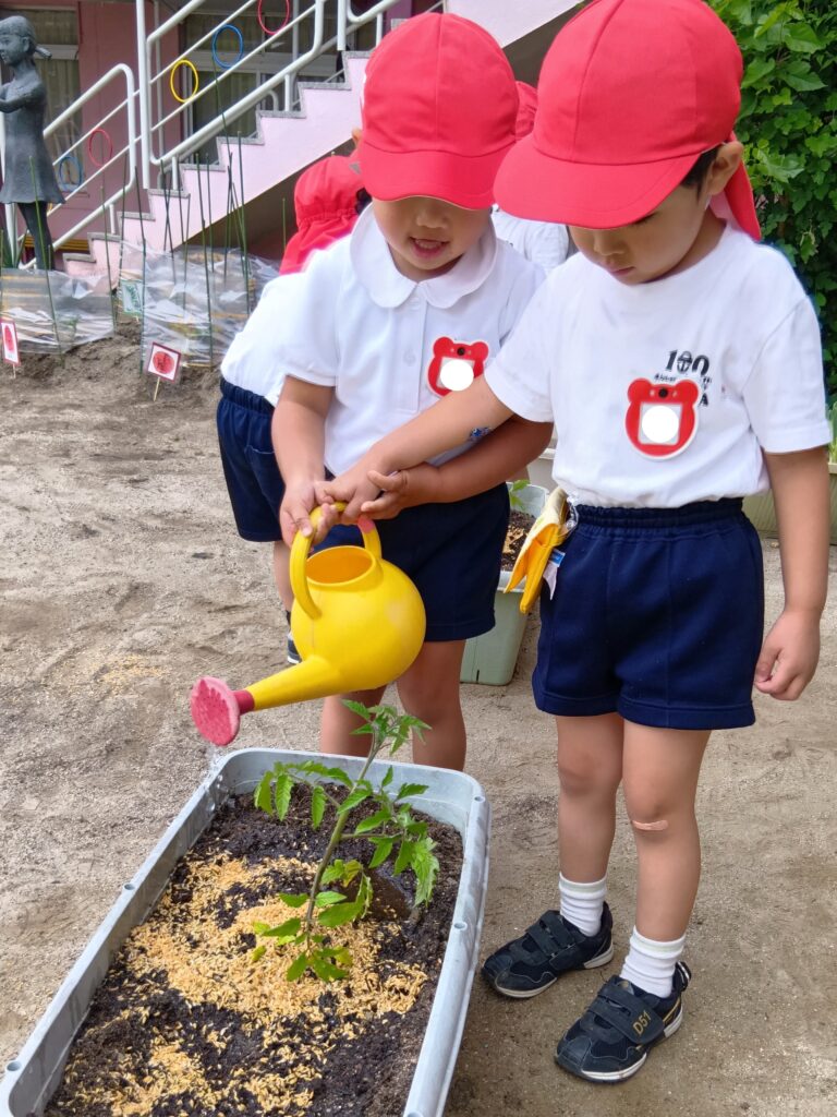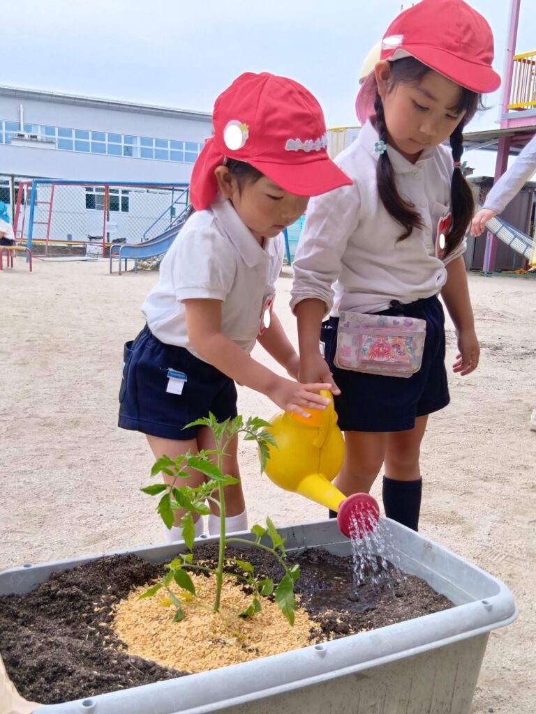 給食の後には、早速「トマトにお水あげなきゃ!」と水やりを進んで行なう子どもたち🌟