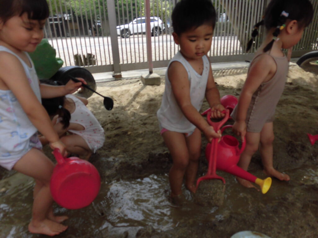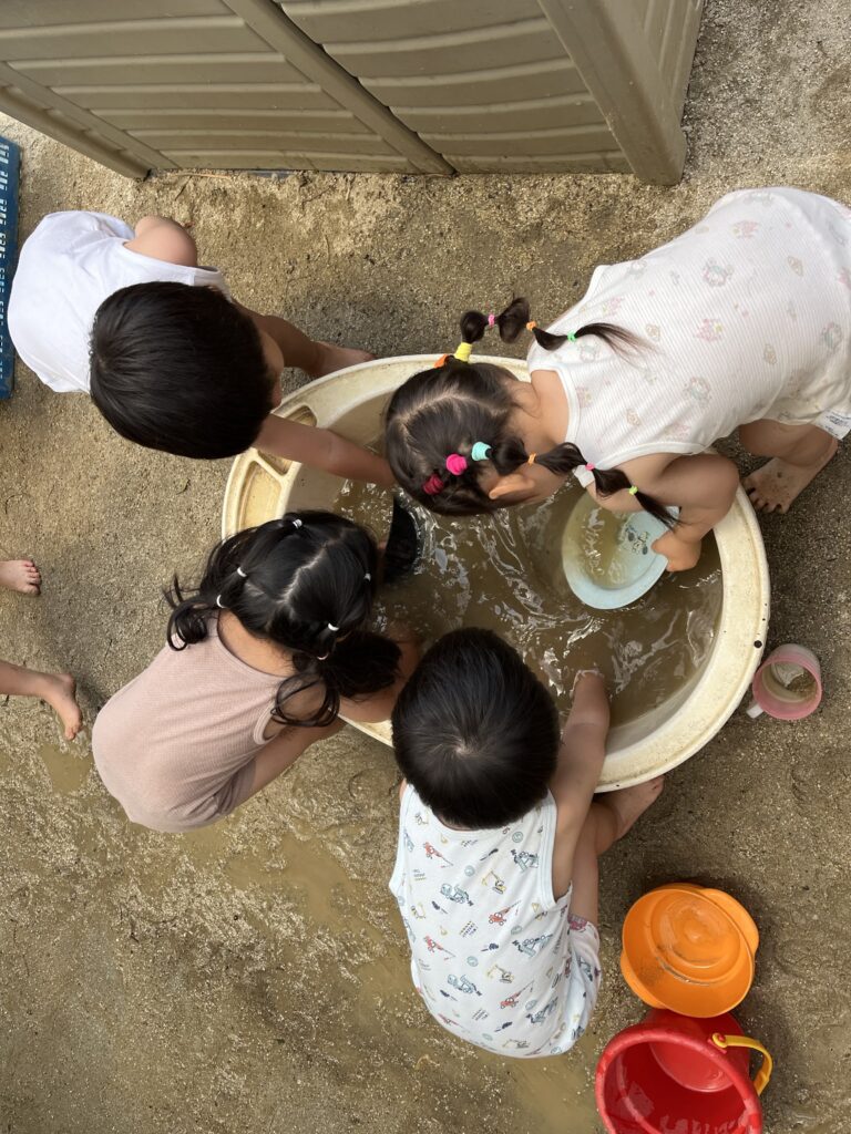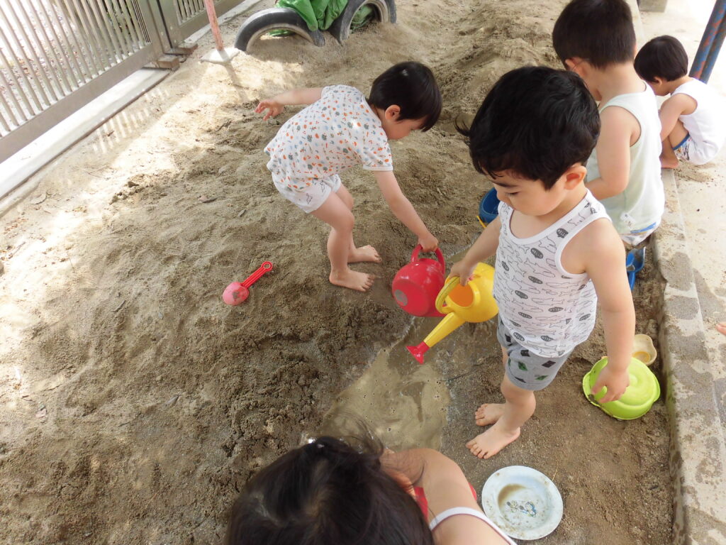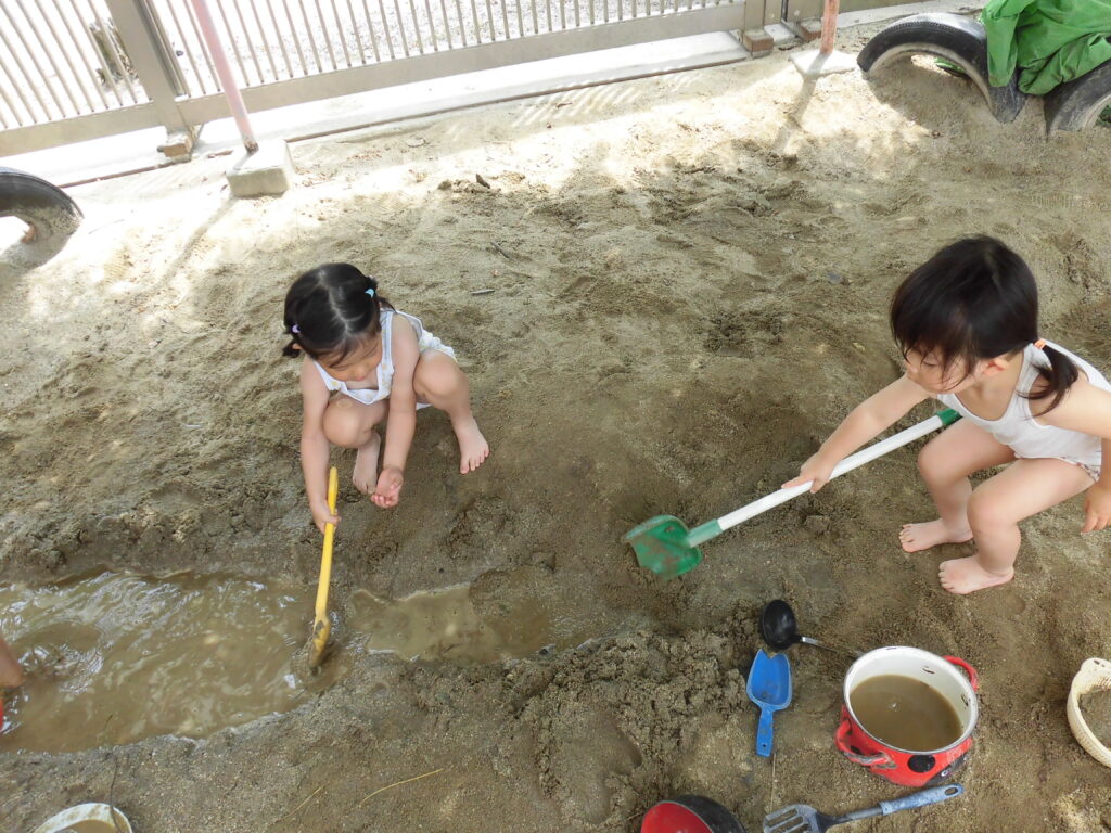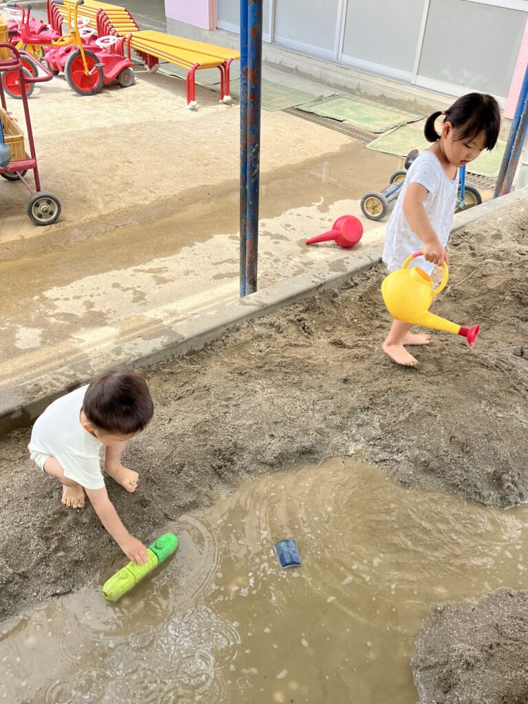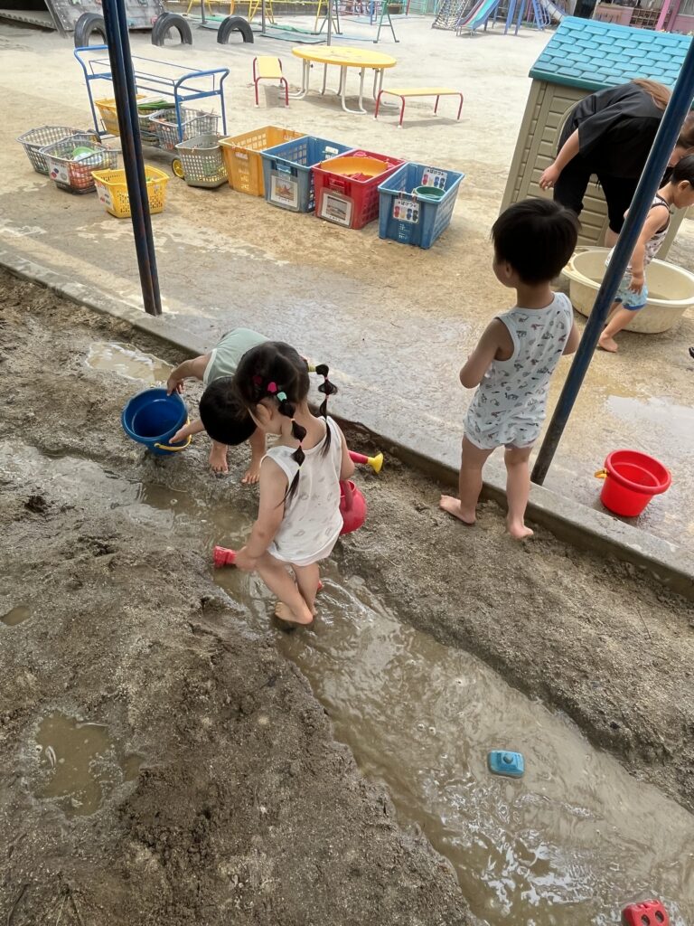 水を沢山流してじゃぶじゃぶと泥の感触を楽しんだり、砂を使ってオリジナルの料理をふるまったりと、思い思いの遊び方で泥や水の感触を楽しみました♪