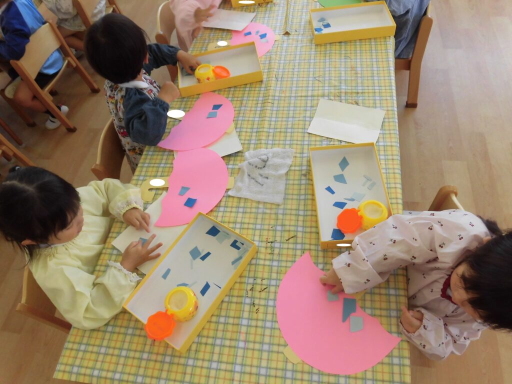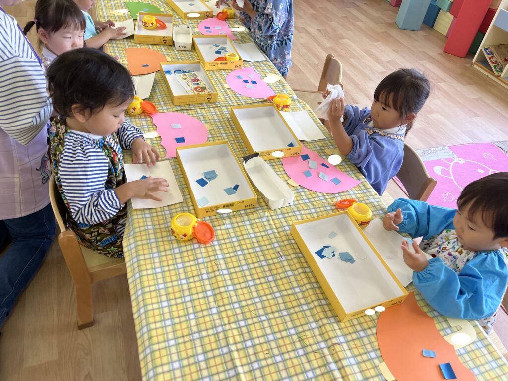 自分で切った画用紙をのりで付けると、「雨がついた!」「みてみて~!」と嬉しそうなにこにこ笑顔が見られました♡