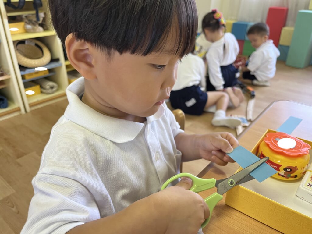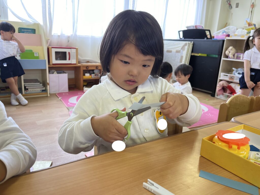 初めてはさみを使って一回切りに挑戦すると、はさみの持ち方や使い方を理解し、一生懸命に守りながら取り組む姿が見られました😊