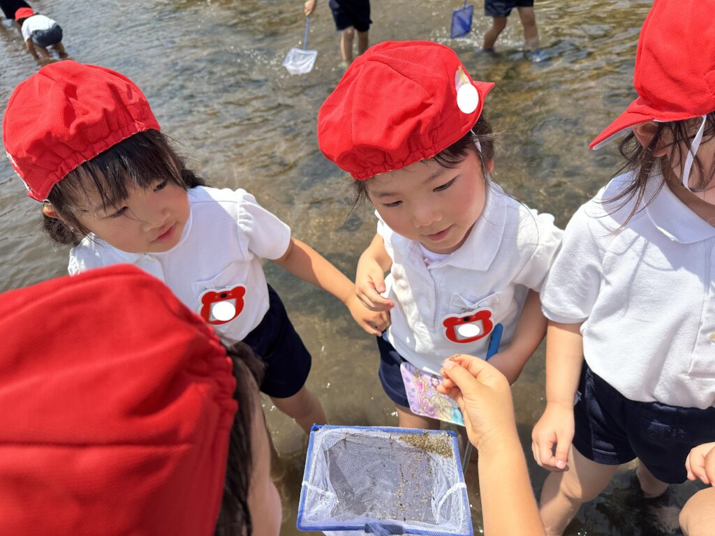 川の中には、ちいさなエビやアメンボ、魚がたくさんいて大興奮なこあら組のみんな♡