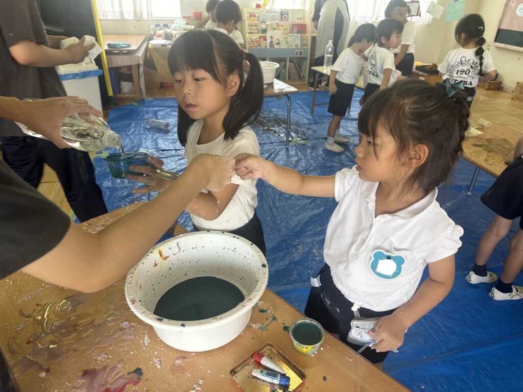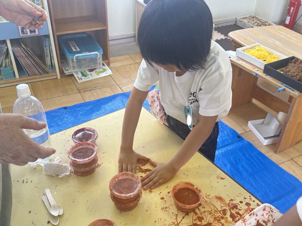 粉の状態と、水を入れた後の感触の違いを感じたり、色を付けたりして楽しみました♩