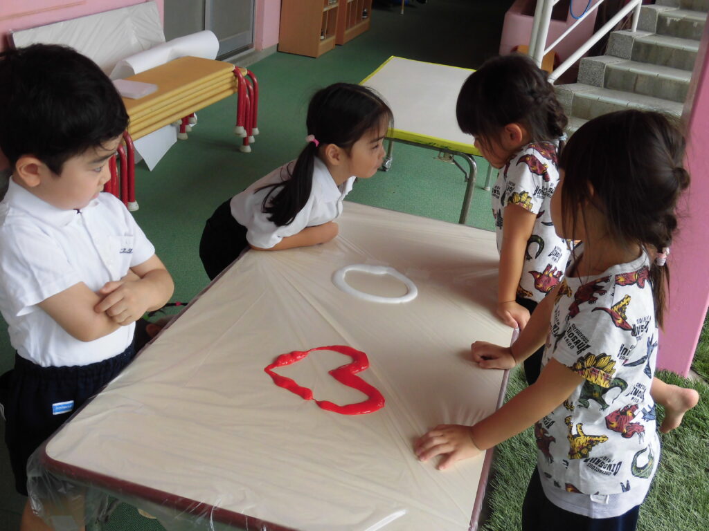 絵の具を触ってみると、「ぬるぬるする~!」「つるつるしてるよ!」と感触の面白さを知ることができました😊