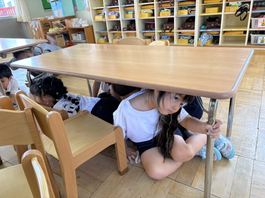 地震が起こったことを想定して、机の下に隠れ、防災頭巾を被って、自分の身を守る訓練ができました!