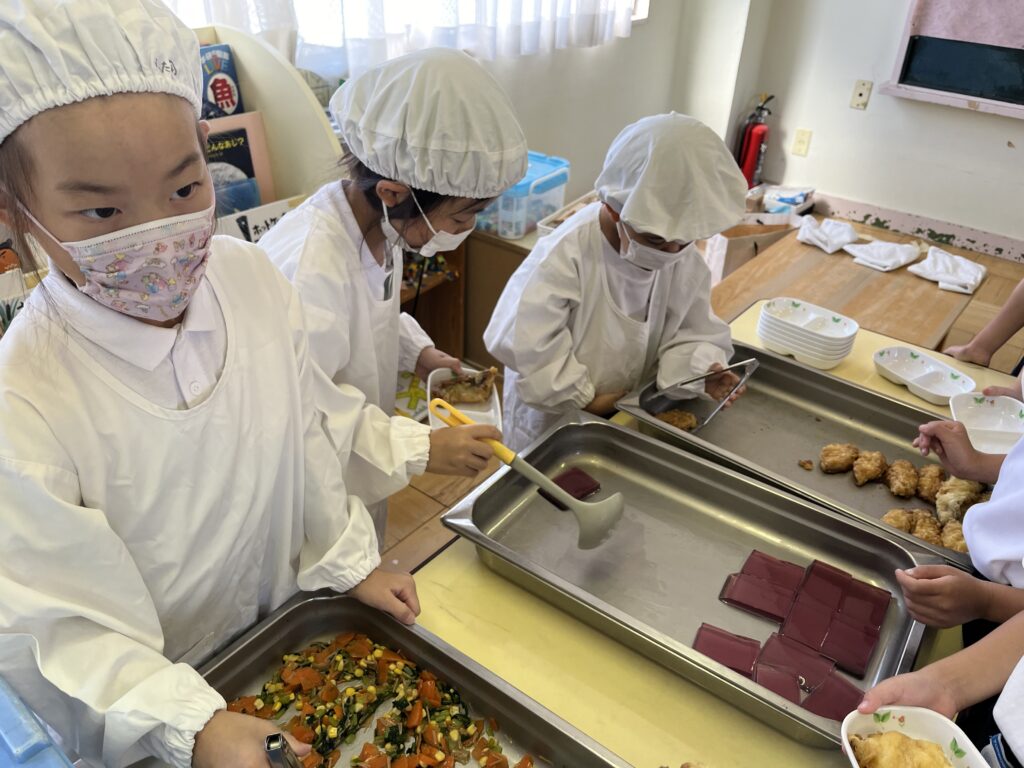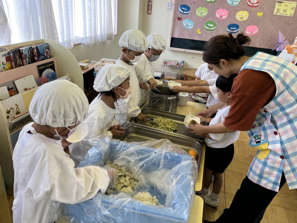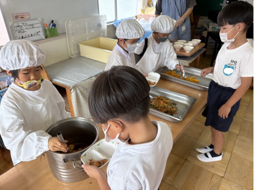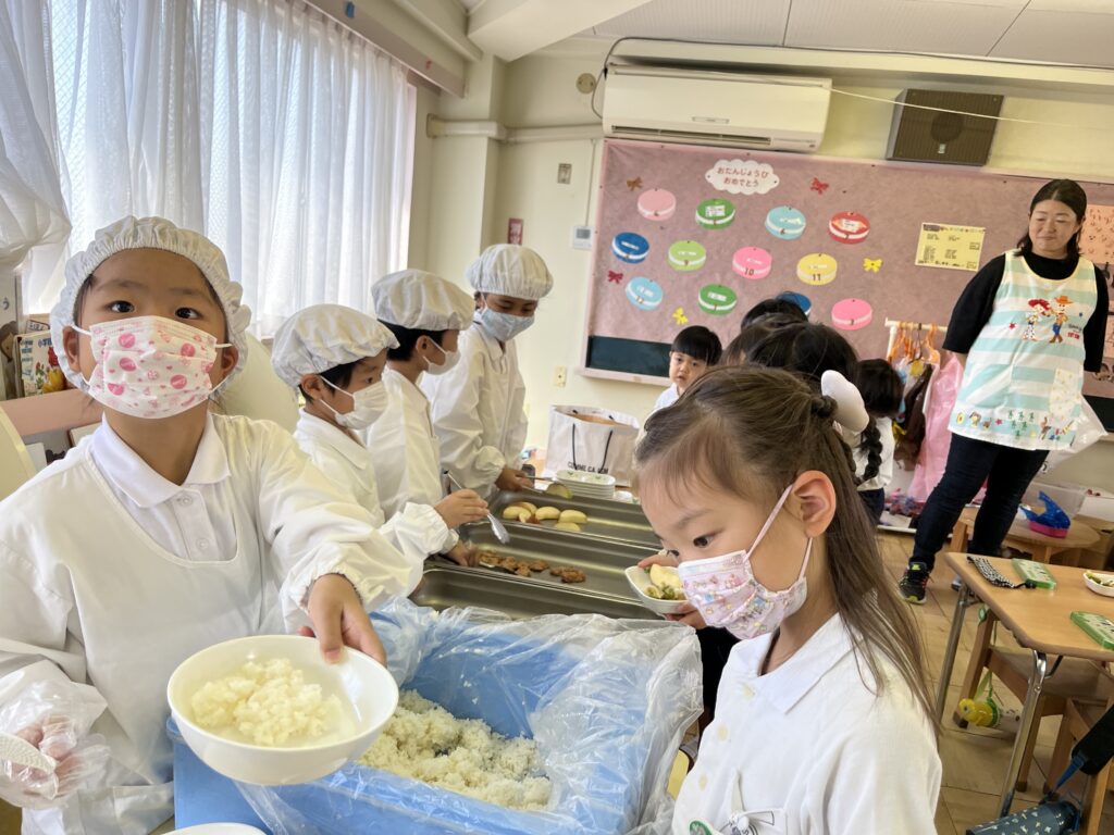 4月から給食当番で、年少さんのお手伝いや机拭き、食缶運び、いただきますの挨拶などのお仕事をしていましたが、10月から配膳も開始しました!