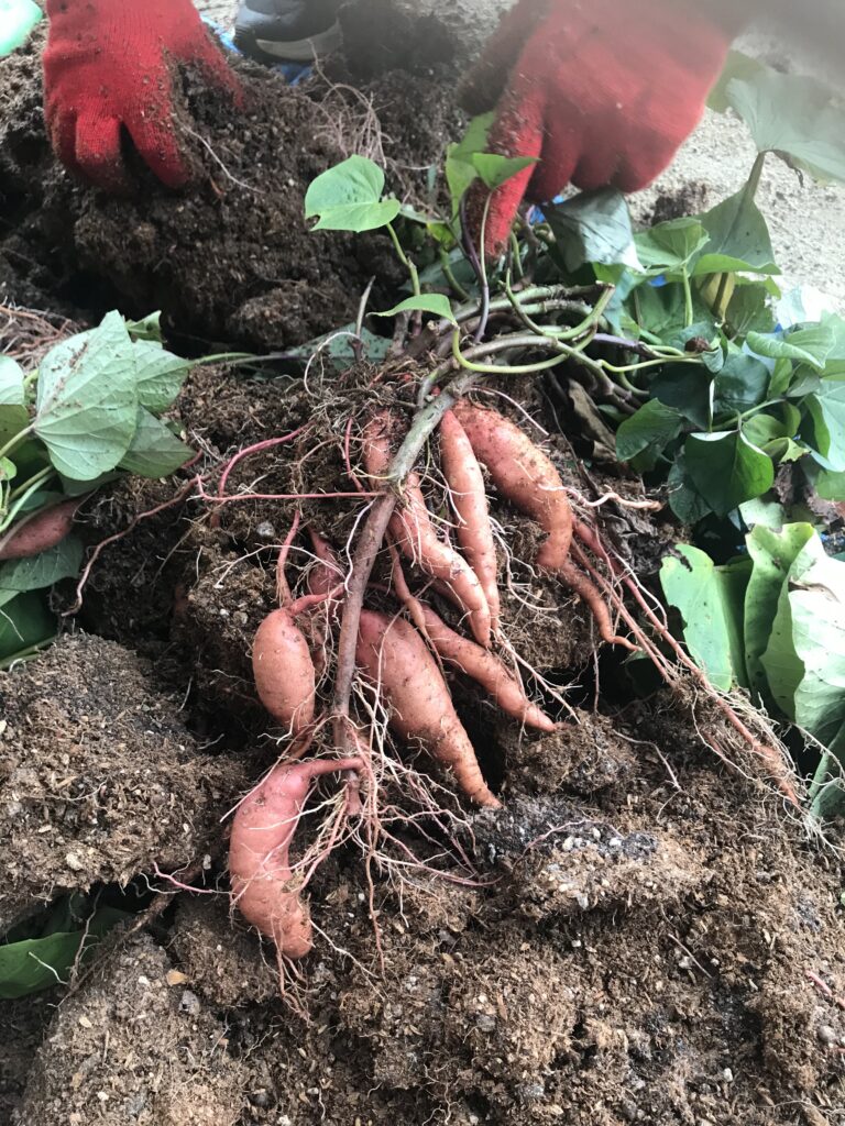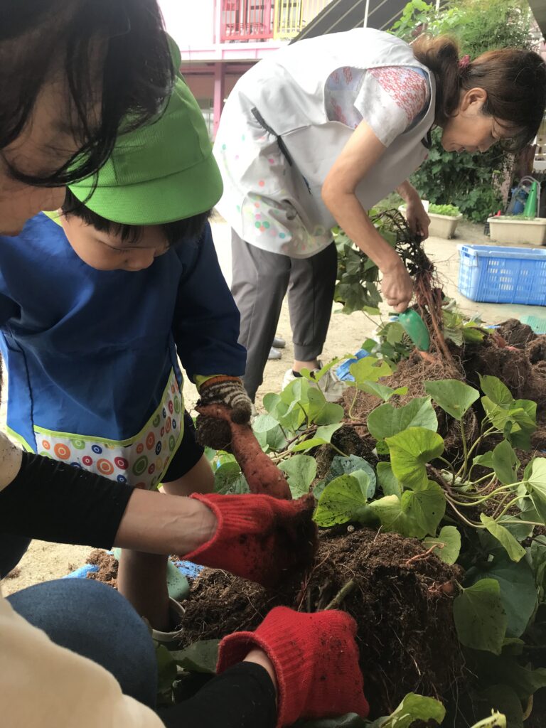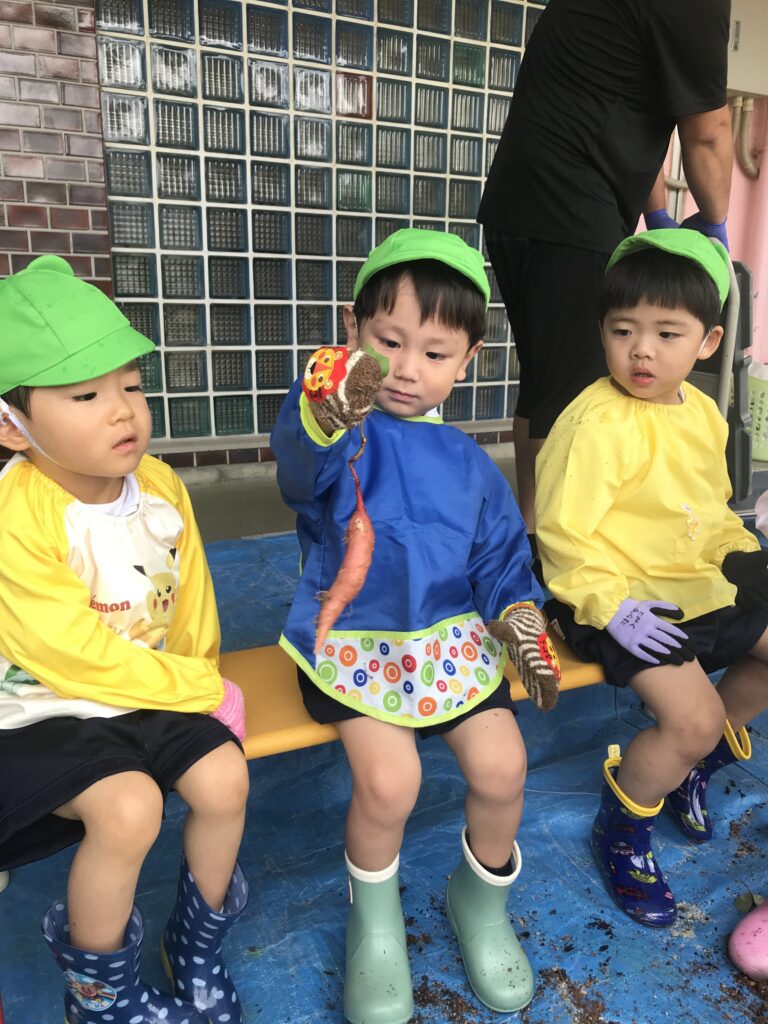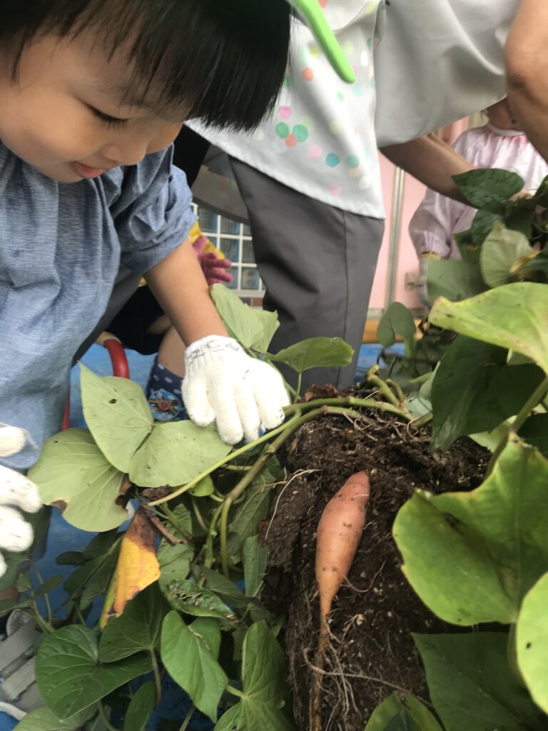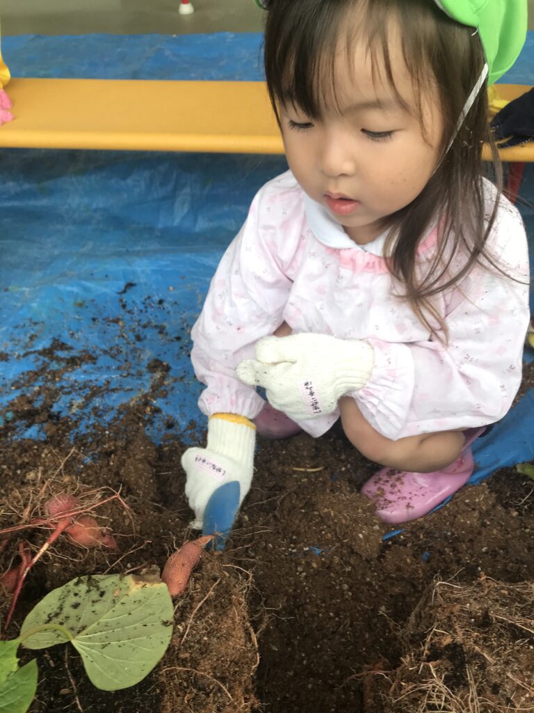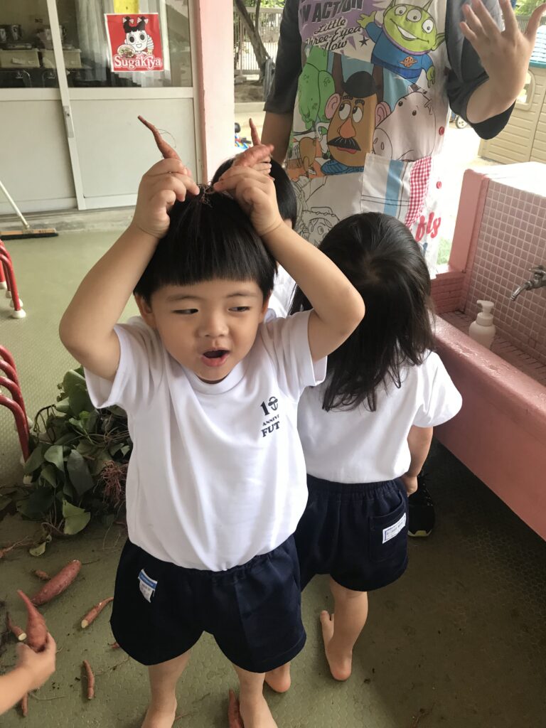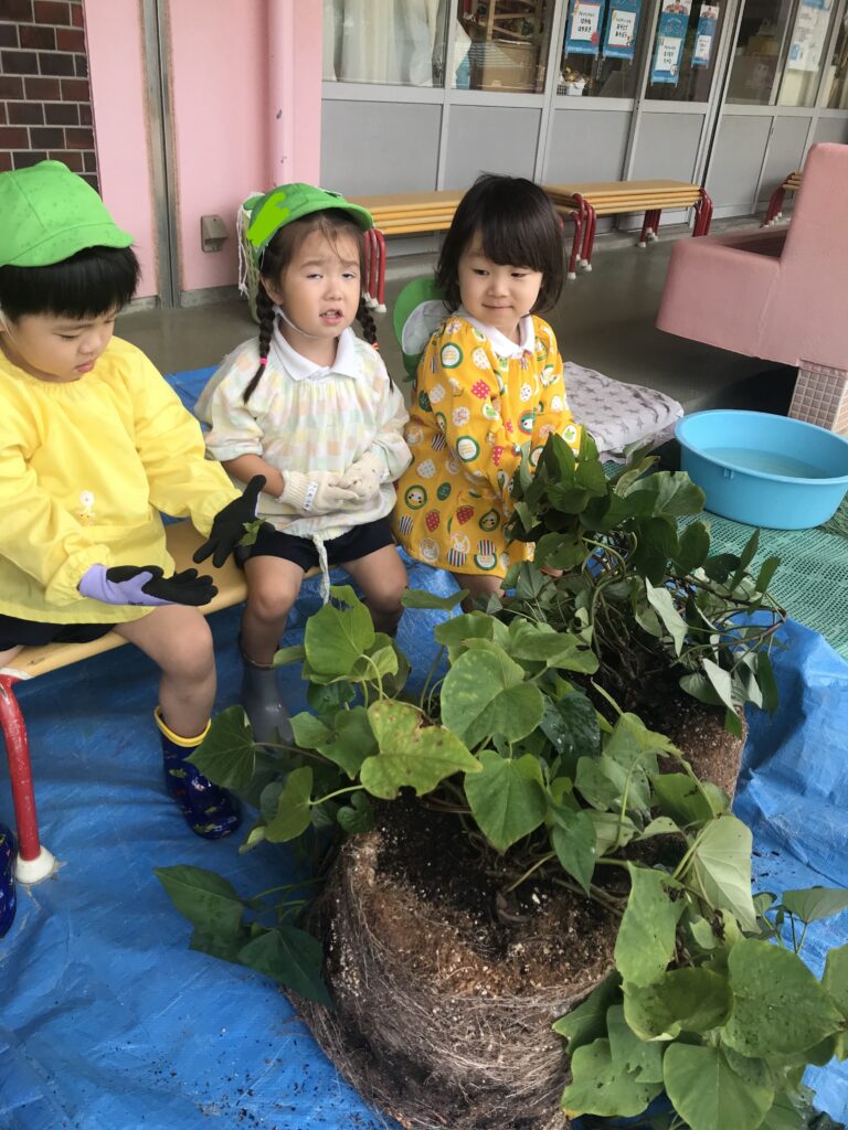 1学期にことり組が飼料袋の中に植えたさつまいも。葉っぱがツヤ土の中でさつまいもが実っているといいなぁと思っていました。今日は、ことり組のみんなで掘ってみることにしました。土の中から出てきたさつまいもを見て「みーつけた!」と歓声をあげている子、じっと見ている子と様々な反応でしたが楽しくさつまいも掘りができました。掘ったさつまいもを頭にのせて「ドキンちゃんだよ」「バイキンマン」と変身して楽しんでいる子や「ヘビいもちゃん」などとお話しながらイメージを膨らませている子もいました。