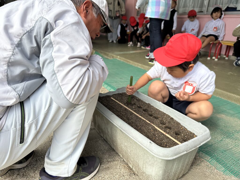 まずは、ねぎを植えるための穴を棒を使って開けて、そこにねぎを差し込んでいきます🎵植え方をよく聞いて、自分たちで丁寧に植えることができました💕