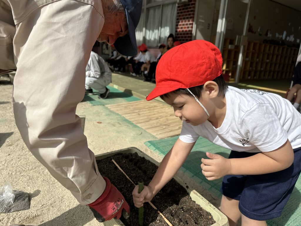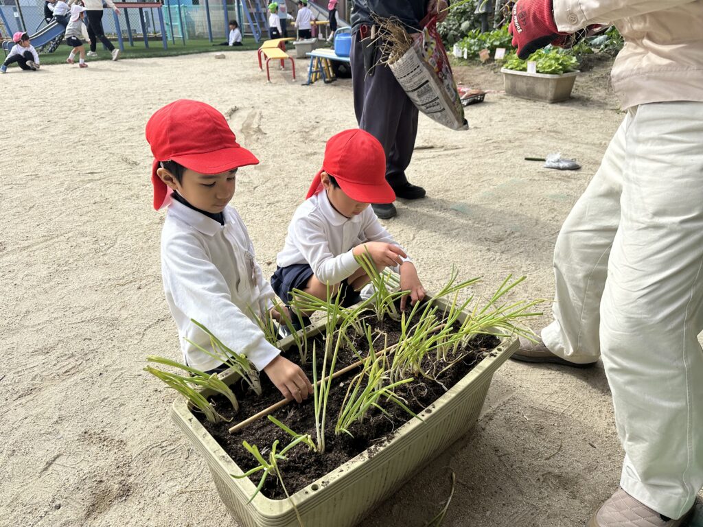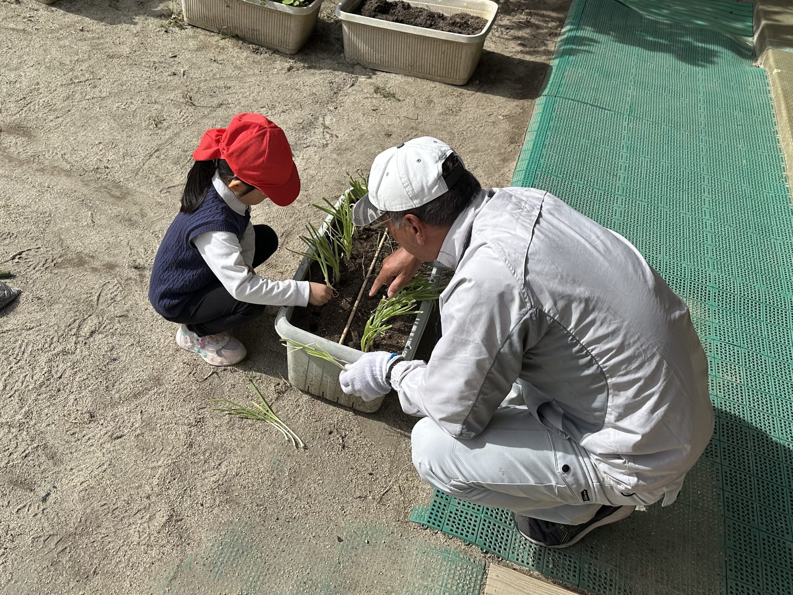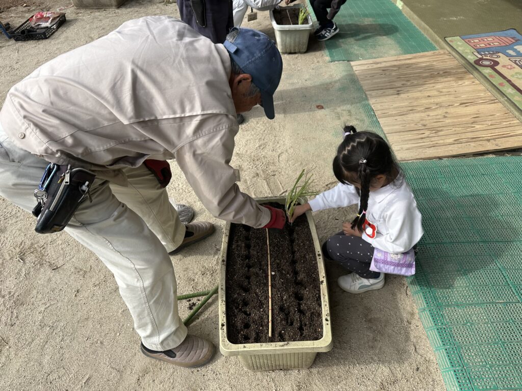 今日は農遊会の方に教えてもらいながら、あいちの伝統野菜『法性寺ねぎ』を植えました!