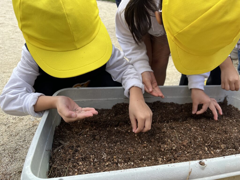 種を丁寧にまいたり、土を被せたりして、みんなでプランターに植えることができました!