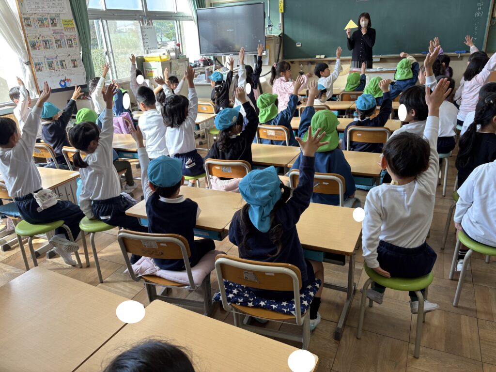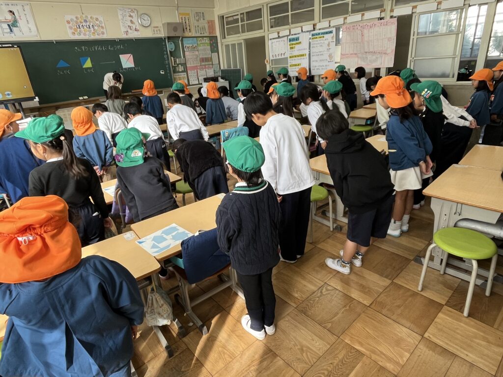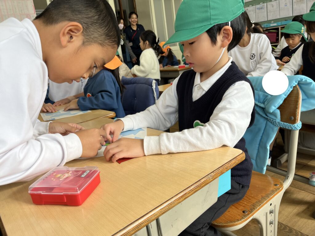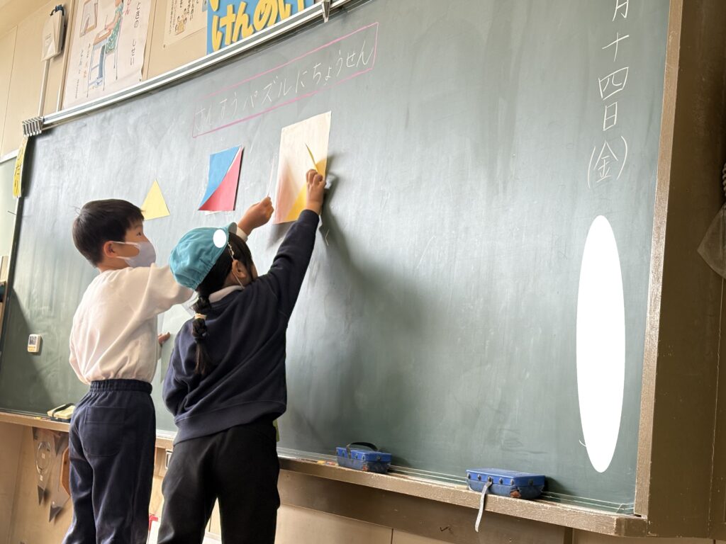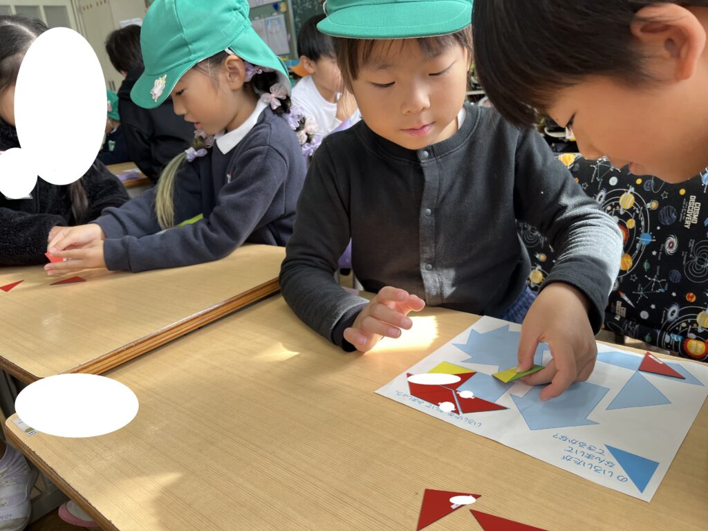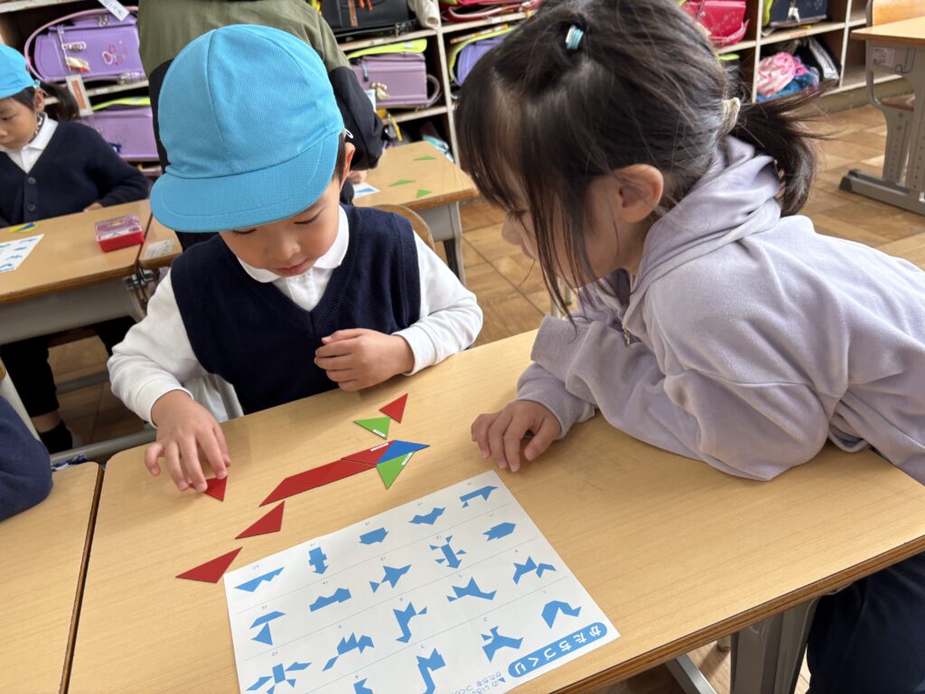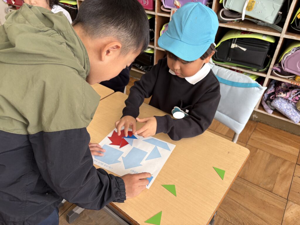 教室に到着すると、小学生のおにいさん、おねえさんが待っていてくれました!一緒に席について算数の授業です!!三角の形を使ってパズルをしました✨三角が2つで四角!!三角が4つで四角!!!!など一緒に考えて楽しく授業に参加することができました👏
