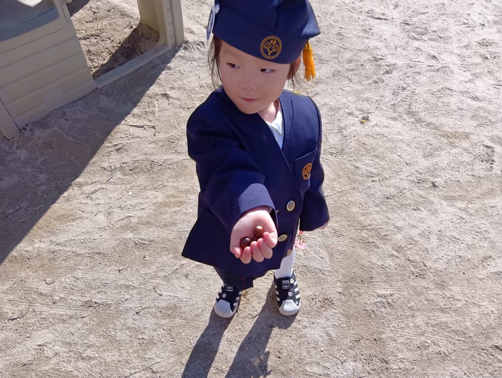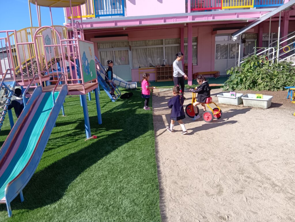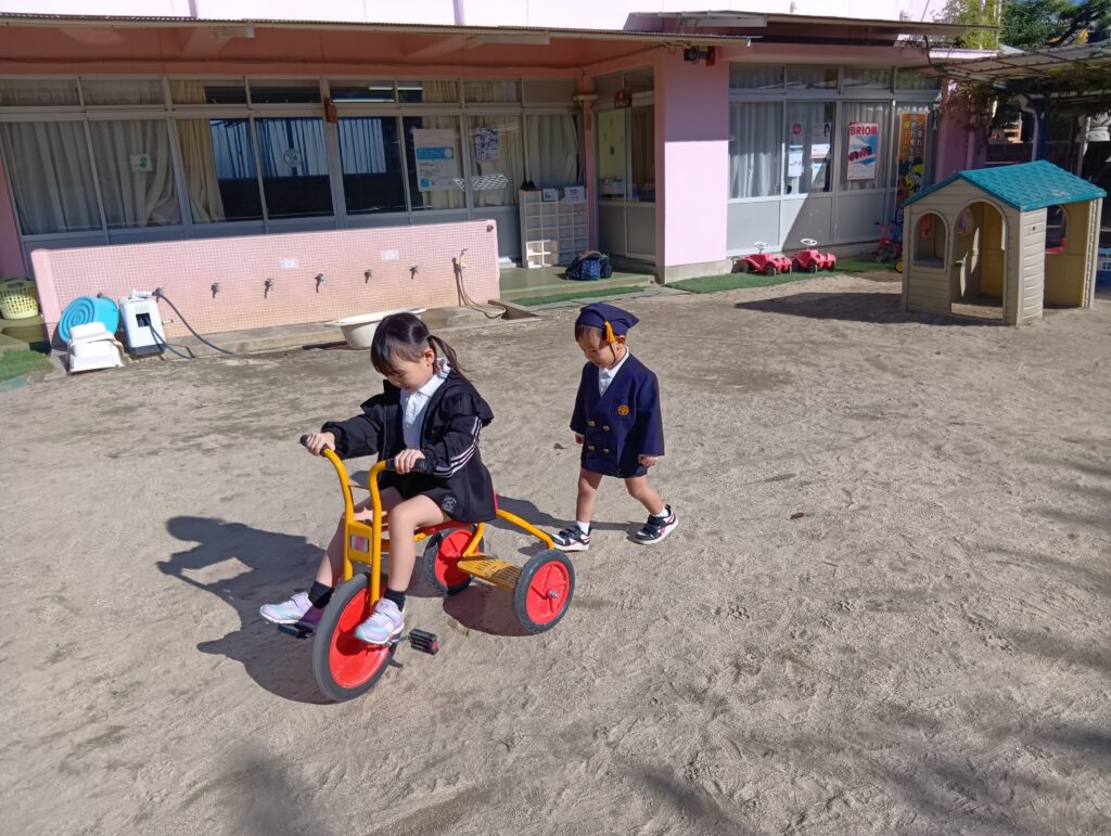 園庭では、砂場遊びや三輪車、どんぐり拾いなど秋の自然を感じながら遊んでいました🍂