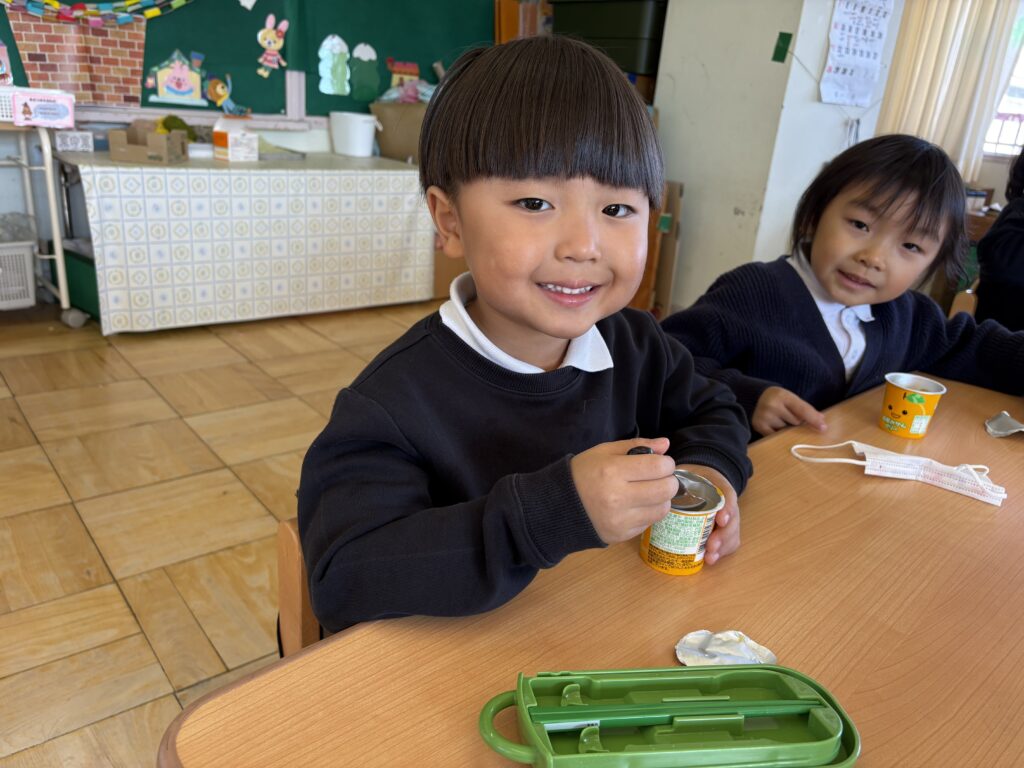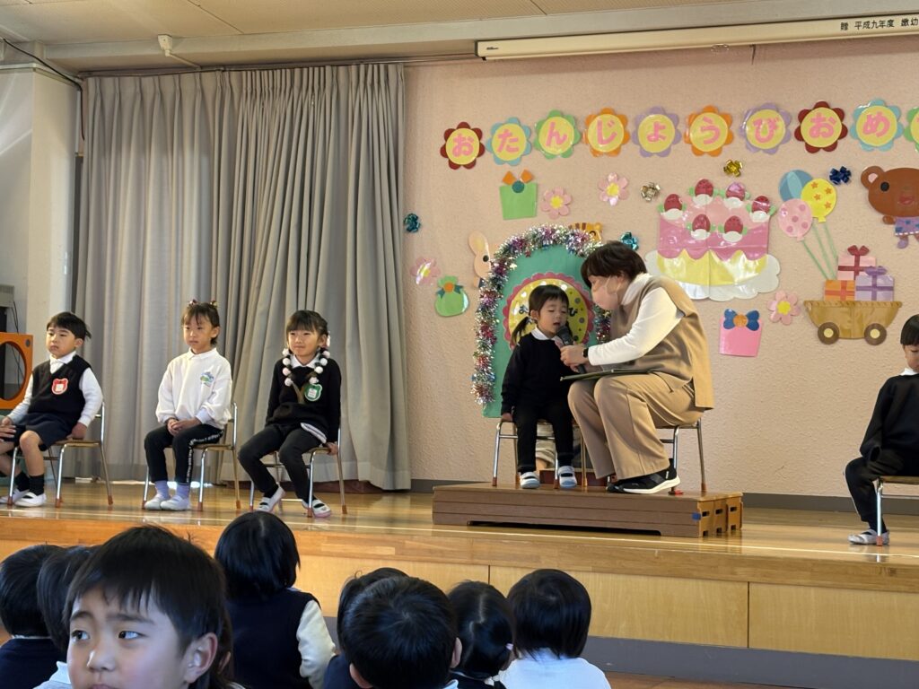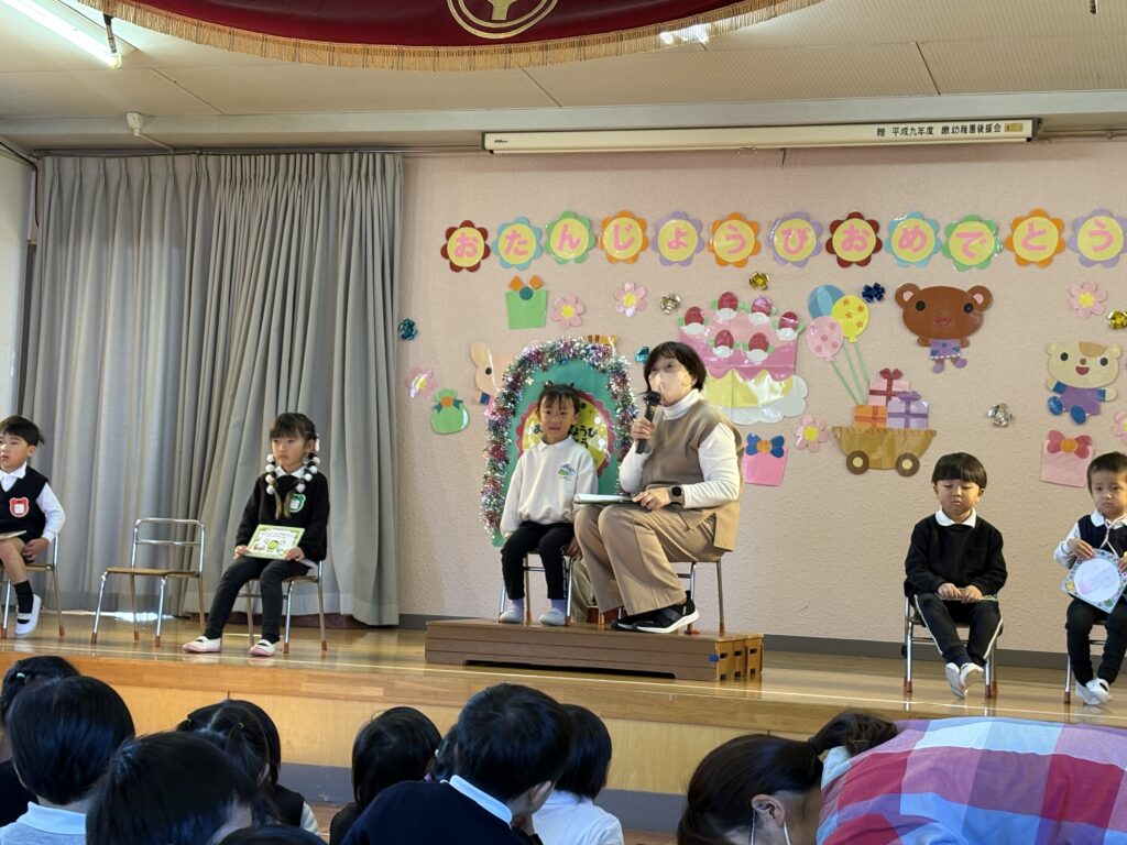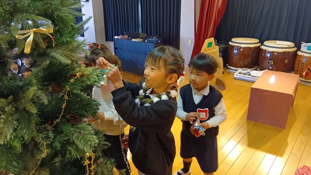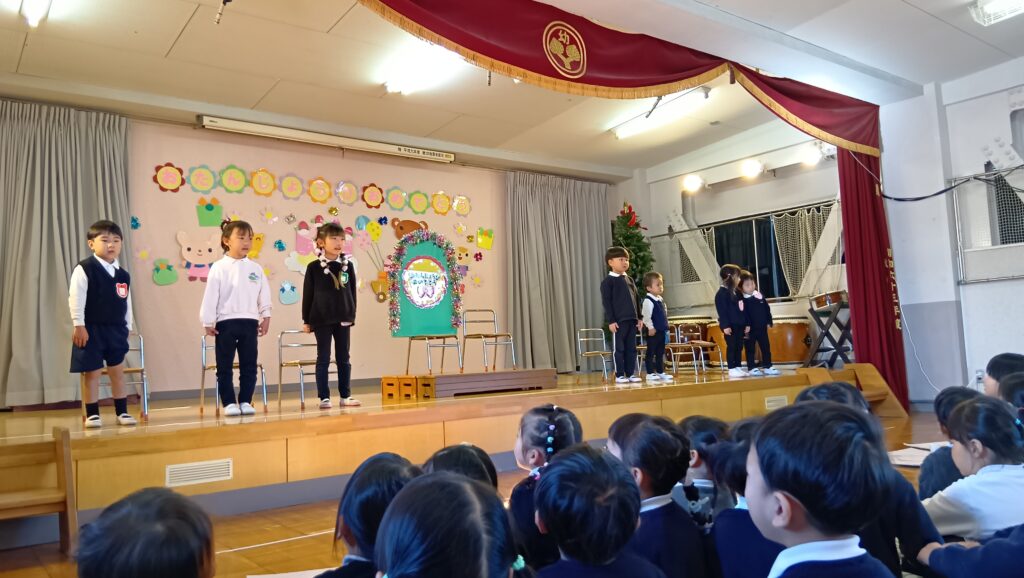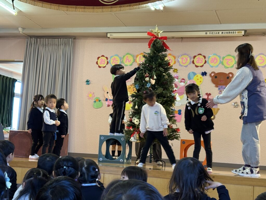今月のお楽しみは、、、先生たちの寸劇「大きなかぶ!」・・・かと思いきや「大きなプレゼント🎁」でした。「うんとこしょ!どっこいしょ!」の掛け声で出てきた大きなプレゼントの中身は、クリスマスツリーの飾り✨誕生日のお友達にツリーに飾り付けをしてもらい、きれいなクリスマスが完成しました💛