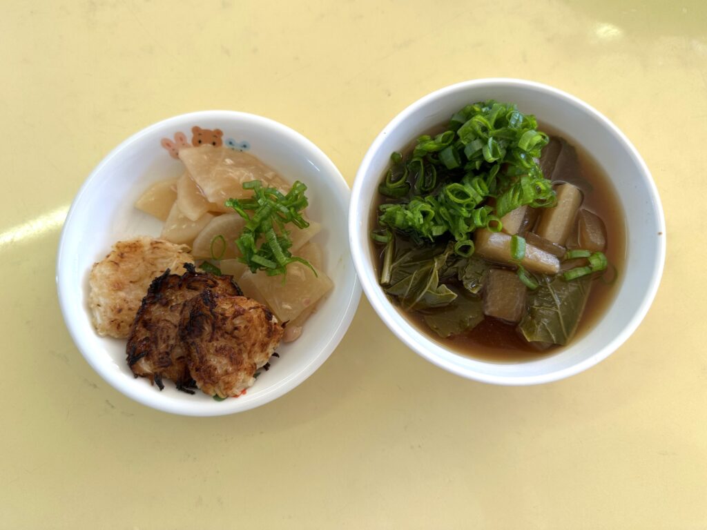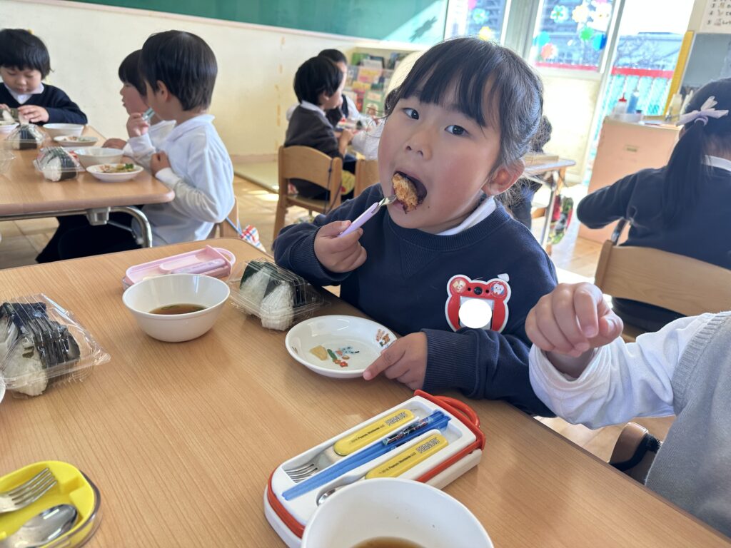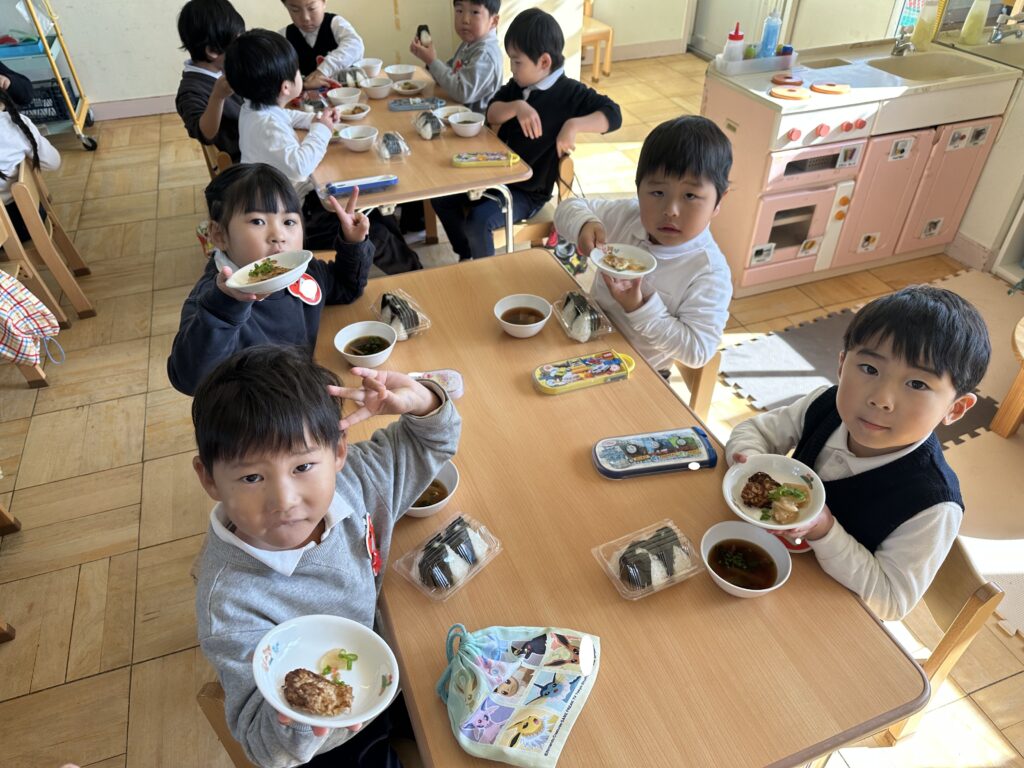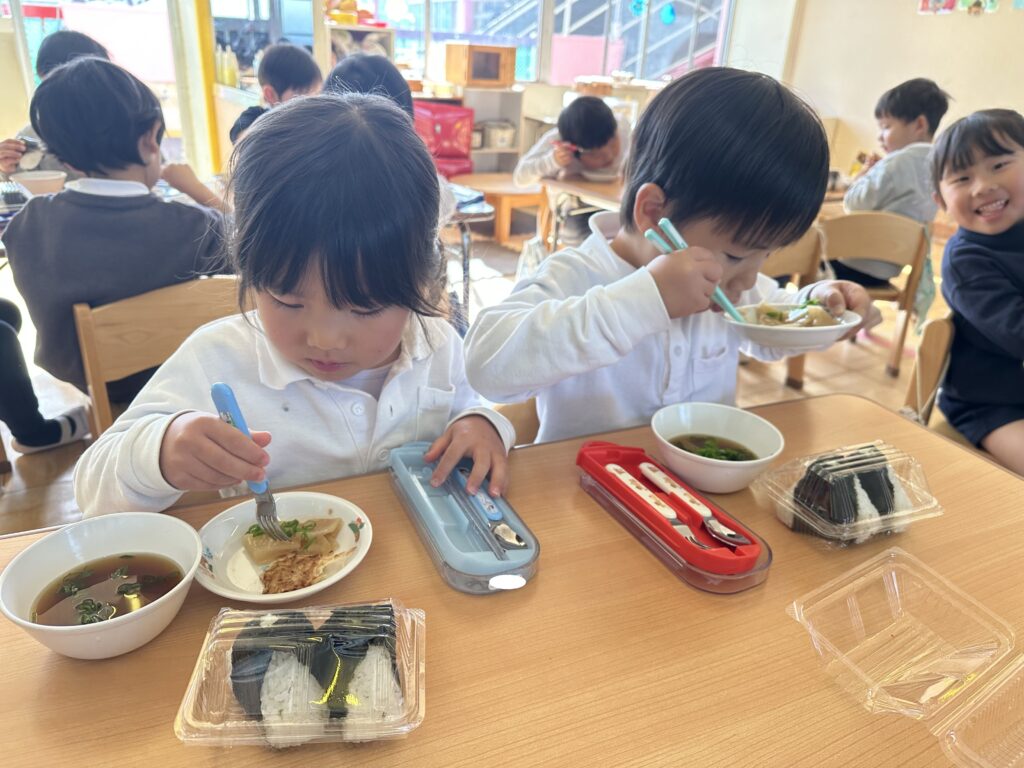幼稚園に帰ってからは、給食で昨日収穫した大根や育てている法性寺ねぎを使った料理を食べました😋