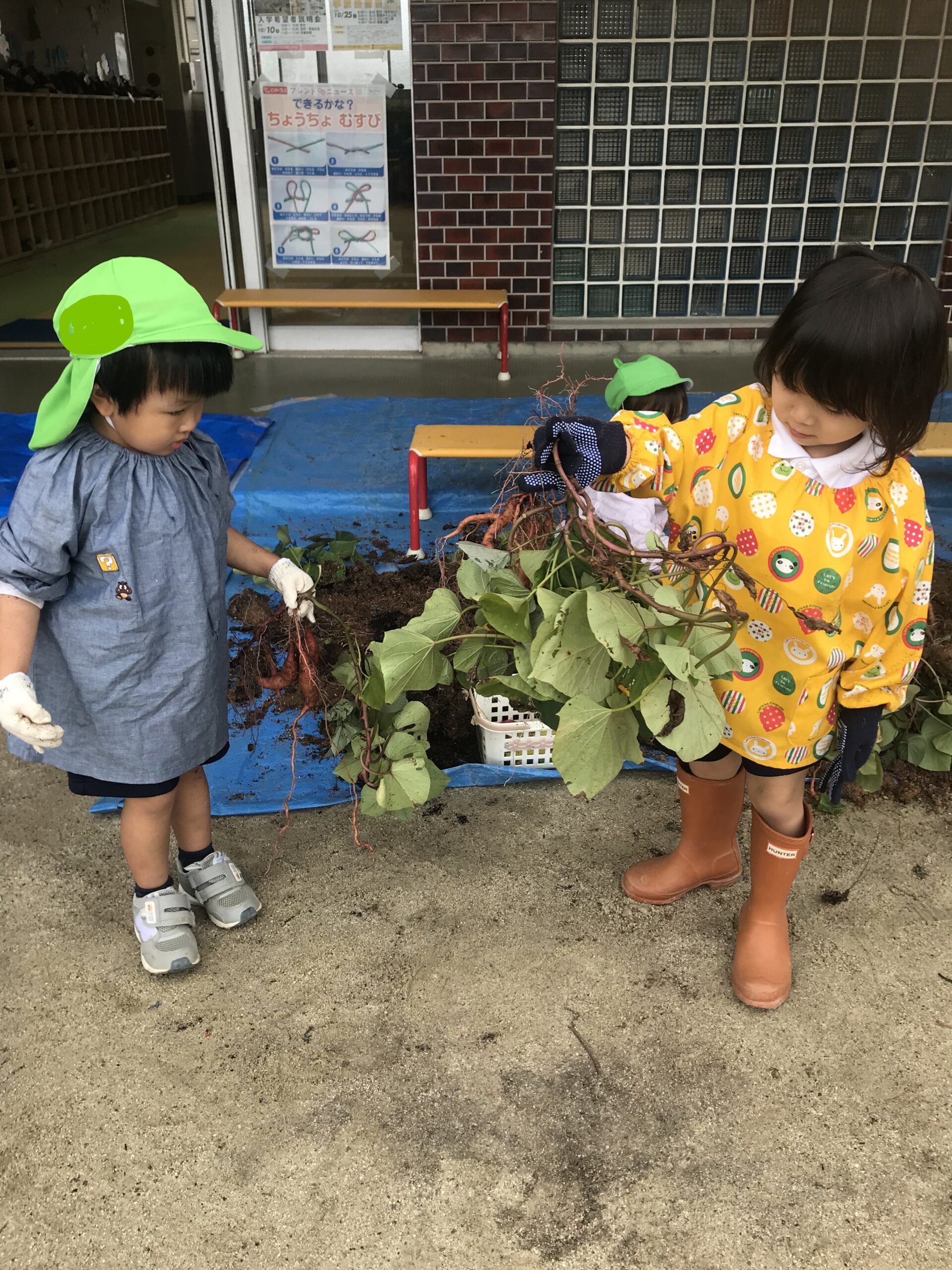1学期にことり組が飼料袋の中に植えたさつまいも。葉っぱがツヤ土の中でさつまいもが実っているといいなぁと思っていました。今日は、ことり組のみんなで掘ってみることにしました。土の中から出てきたさつまいもを見て「みーつけた! […]