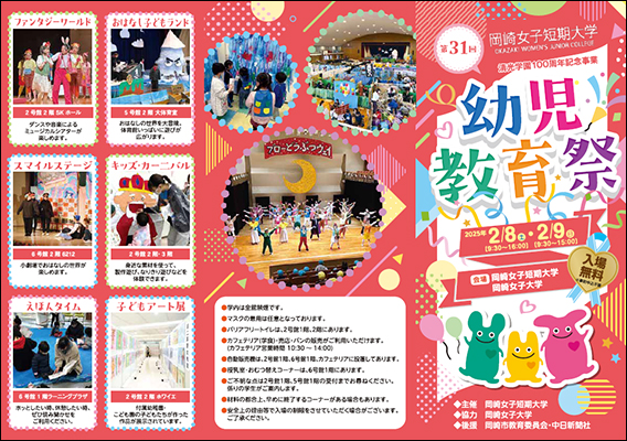 | 2月8日(土)には、中学生・高校生向けの幼児教育祭見学ツアー(開催時間:10:00〜14:00)も実施致します。 詳細については、以下のサイトの下方にある「幼児教育祭見学会(中学生・高校生限定)」をご確認ください。 https://okazaki.ac.jp/opencampus/ こちらは完全予約制となっていますので、下記URLからお申込みください。 https://ws.formzu.net/dist/S91554351/ |