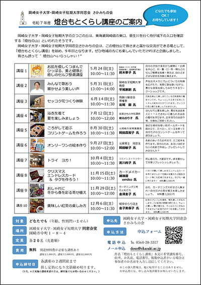 令和7年度 同窓会 さかみちの会主催の「燈台もとくらし講座」は10講座を予定しています。皆さんの要望の多かった講座や、新規の講座など色々ありますよ。