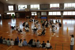 「パズルめくり」ゲームでは、両面の色が違うジョイントマットを利用して、「ヨーイドン!」で自分のチームの色に裏返していきます。終始中腰での戦いはかなりハードな運動になりました。