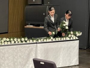 本学からは子ども教育学部北浦ゼミナールの4年生6名が参列し、誓いの言葉と典礼、献花の補助をさせていただきました。誓いの言葉は学生たちが考えたものです。以下に掲載しますのでぜひご一読ください。