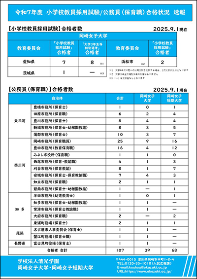 就職に強い岡崎女子大学・岡崎女子短期大学です! 続々と公務員合格者が出ています。 他市町村の情報も随時更新していきます。 「内定者速報」をオフィシャルサイトの「就職サポート」にも掲載していきますので、ご確認ください。