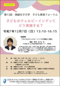 岡崎女子大学の第13回子ども教育フォーラムが12月7日(日曜日)に開催されます。