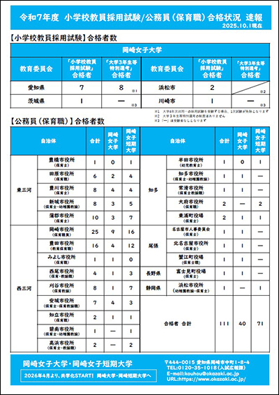 小学校教員採用試験の合格者は11名となりました。 公務員(保育職)には、岡崎女子大学・岡崎女子短期大学合わせて111名が合格しています。