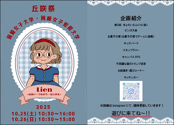 2025年度の丘咲祭のテーマは「Lien(リアン)~出会い・つながり・はじまる~」です。 今まで出会ってきた人・環境などのつながりを大切に、新たに様々な人・環境に出会い”輪”を広げていこうという願いが込められています。 日時は10月25日(土)10:30~16:00、26日(日)は10:30~15:00です。 詳しい内容は公式サイト、Instagramでも更新していますので是非ご覧ください。 たくさんの方のご来場をお待ちしています。