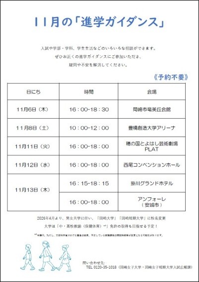 入試や学部・学科、学生生活などのいろいろな相談ができます。 ぜひお近くの進学ガイダンスにご参加いただき、疑問や不安を解消してください。