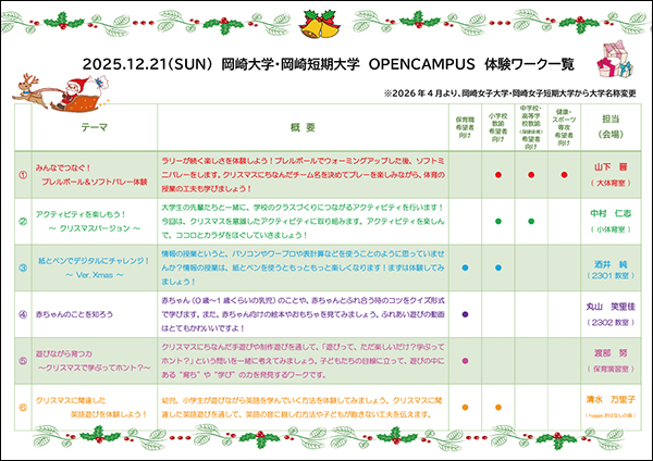 12月21日(日)オープンキャンパス 体験ワーク一覧