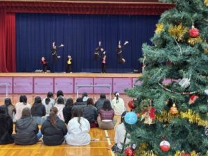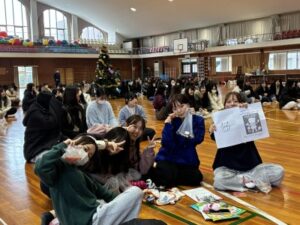 ダンス部によるダンスが披露され、素敵なスタートに会場は大盛り上がり、お菓子投げやクリスマス会恒例のビンゴ大会が行われ、サンタさんからのプレゼントをもらいました。みんな仲良く交流ができ、笑顔溢れる楽しい時を過ごすことができました。