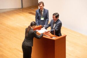 なお、当日午前には本学3年生による専門ゼミナール中間発表が行われました。また、フォーラム開催に先立ち、「建学の精神エッセイコンクール」入賞者の表彰式も行われました。