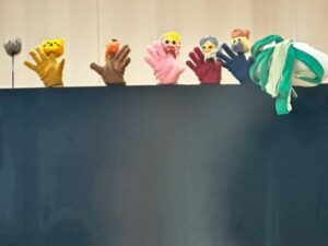 また、人形劇の合間にエプロンシアター「3びきのやぎのがらがらどん」、「ブレーメンの音楽隊」などを実践しました。