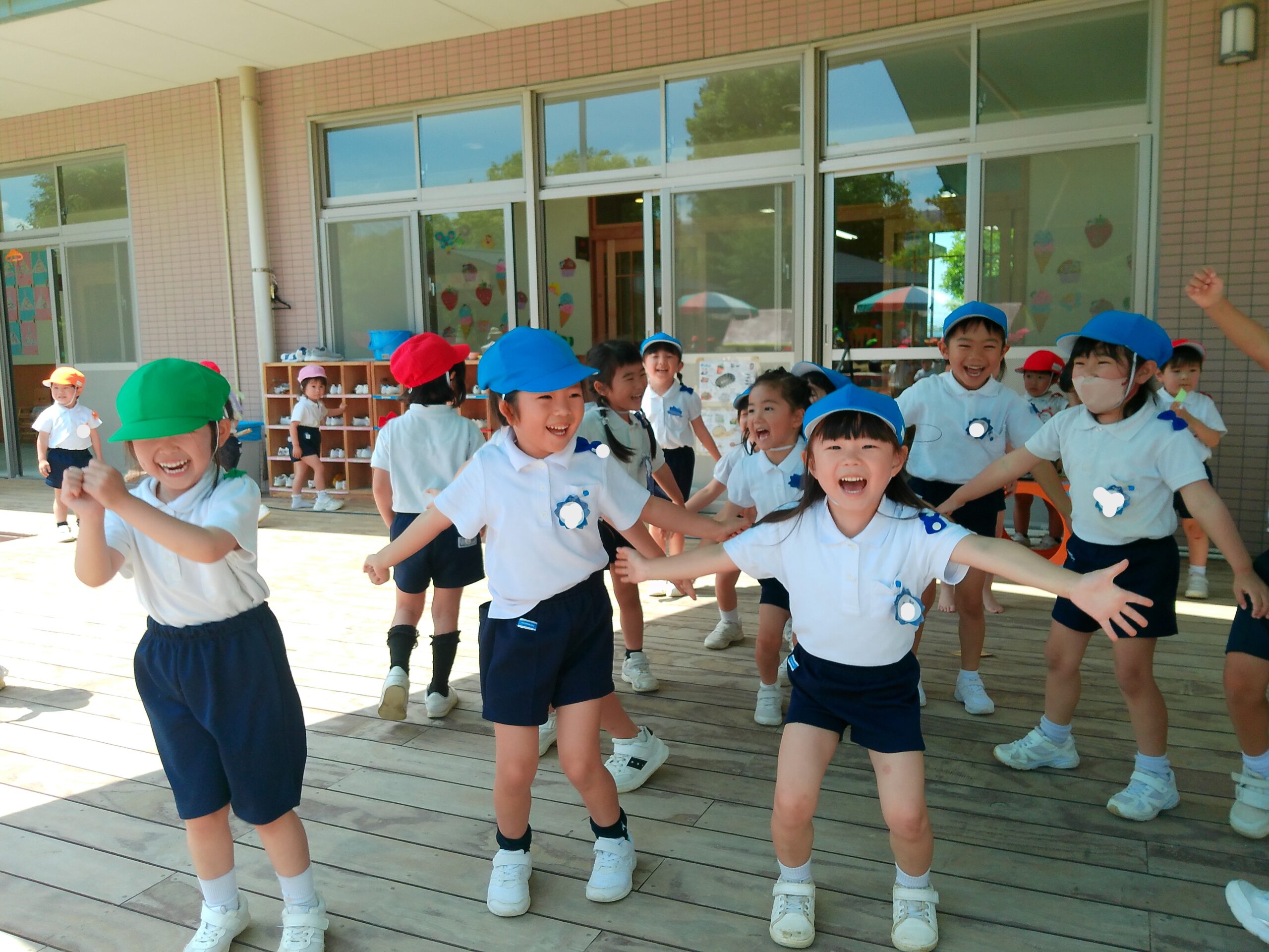 年長さくら組では、『それもいいね♪』と『カリスマックス』の歌が流行っていて、エントランスにステージを作り、毎日ダンスをして盛り上がっています☆ 手の先までピンピンで、キレキレなダンスをお客さんに見てもらっています!