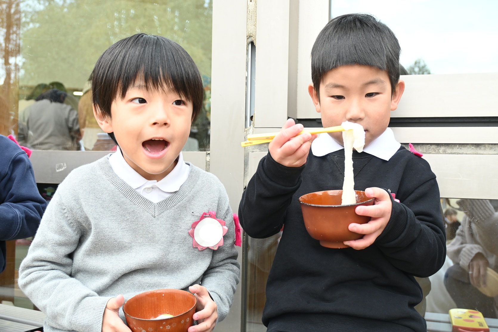12月のおもちつきでついたおもちを、年中・年長さんがお雑煮にして食べました! 「お雑煮ができましたよ~」の放送でエントランスに行き、家から持ってきたお椀に出来立てのお雑煮を入れてもらいました。 ウッドデッキに座って「あっ […]