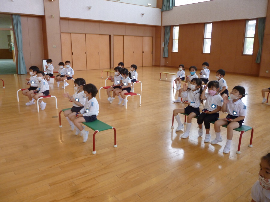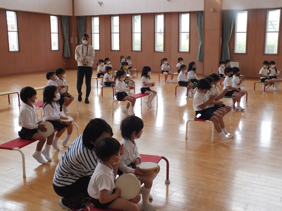 カスタネット、鈴、タンバリン、トライアングルに分かれて「となりのトトロ」の曲に合わせて演奏を楽しみました。
