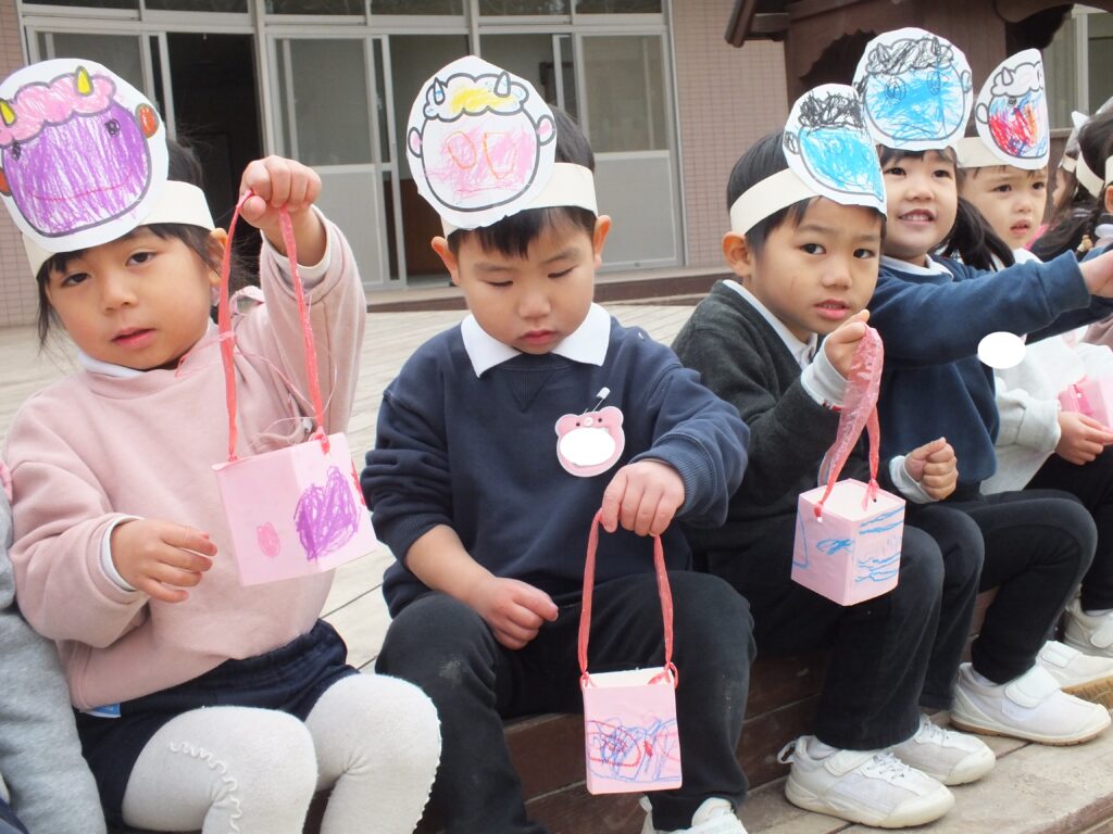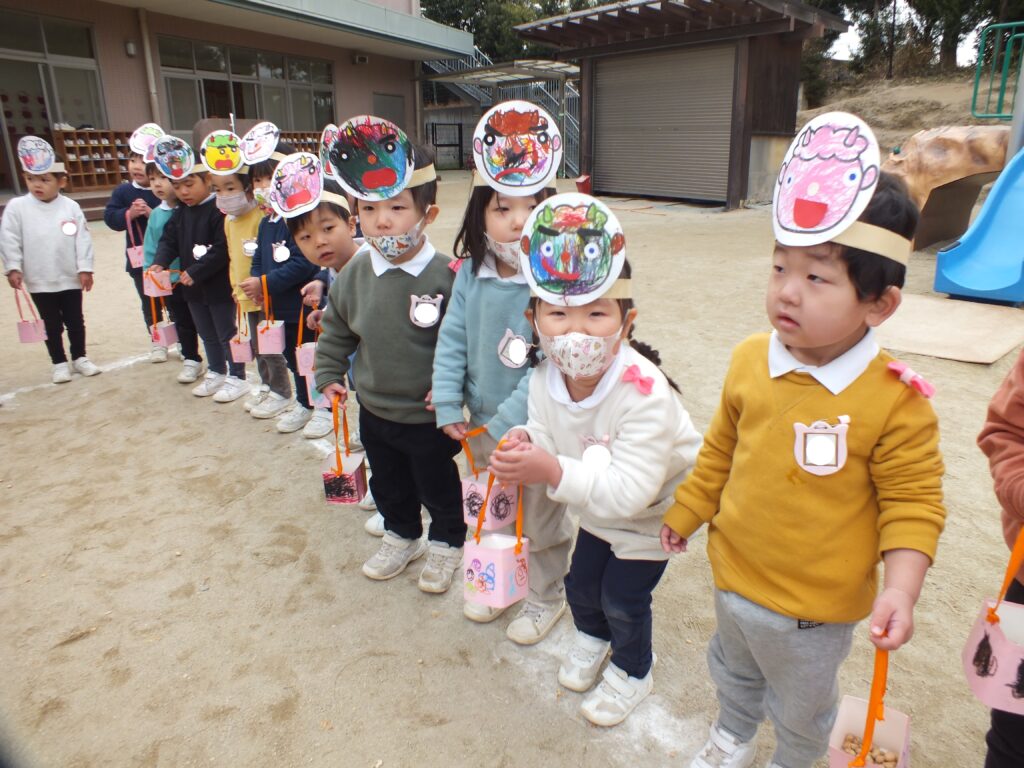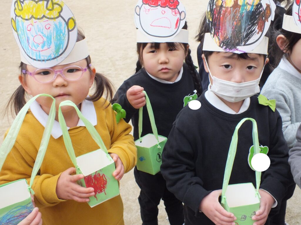 子どもたちは、自分で作ったお面や豆入れを身に付けて準備万端!