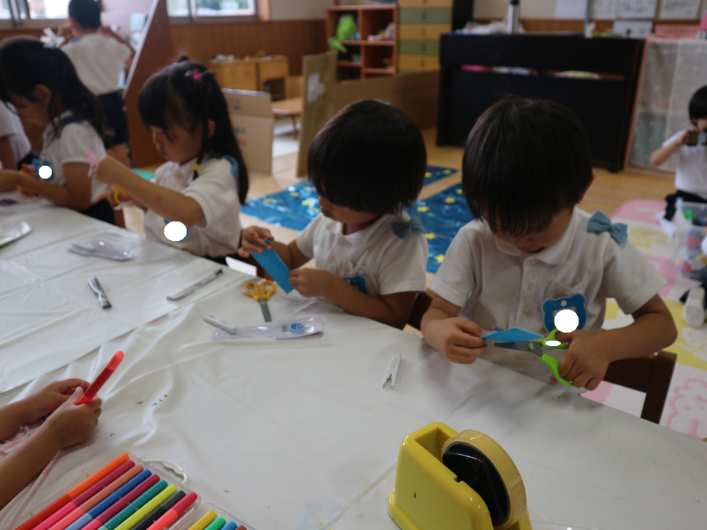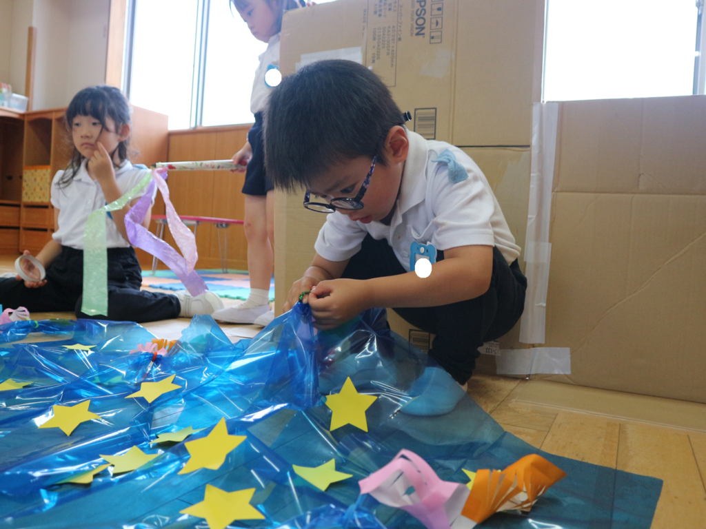 星の形に切った画用紙をテープで貼ったり、貝つなぎを作って友達の作ったものと繋げたり・・・。