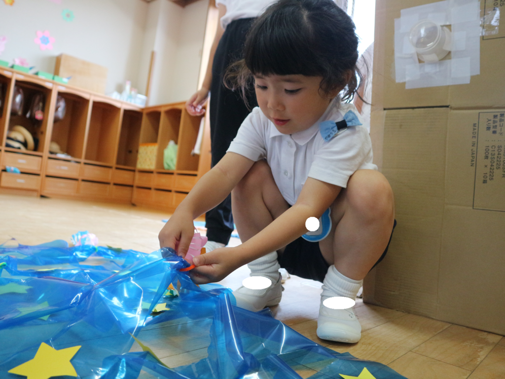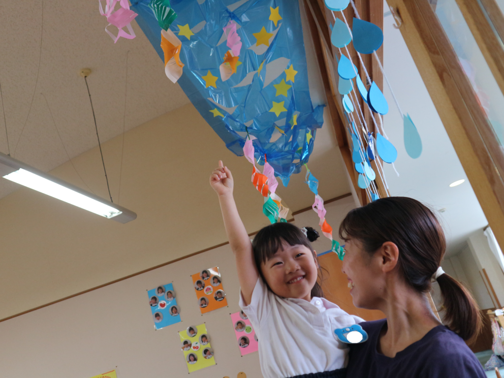 「みんなで天の川に飾り付けようと思うんだけどどう?」と提案すると「やりたい!」「いいね!」「もうすぐ七夕だもんね!」と大賛成♪