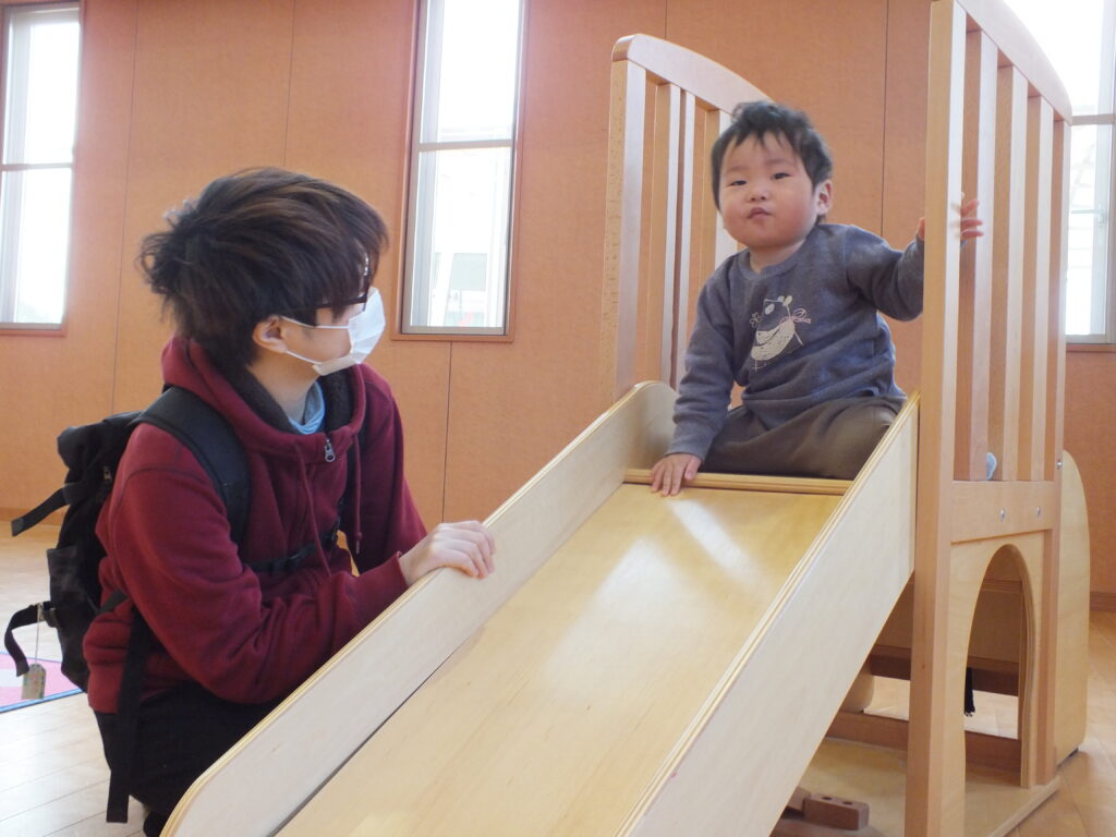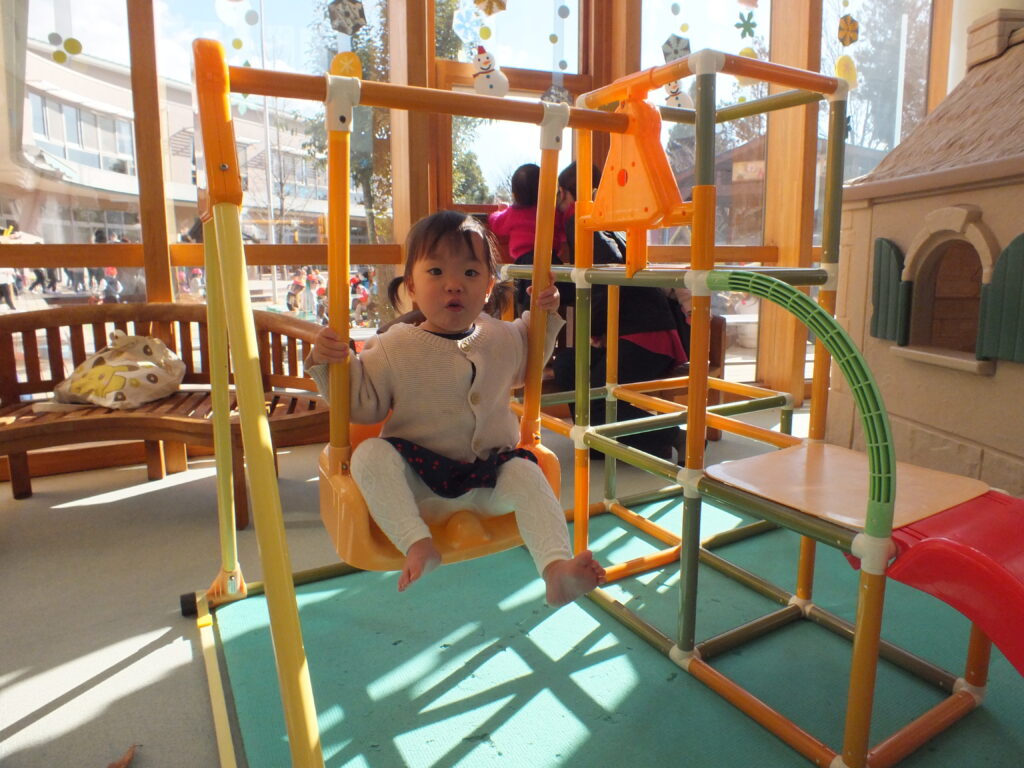 遊戯ホールの滑り台で遊んだり、エントランスのブランコの乗ったり・・・。
