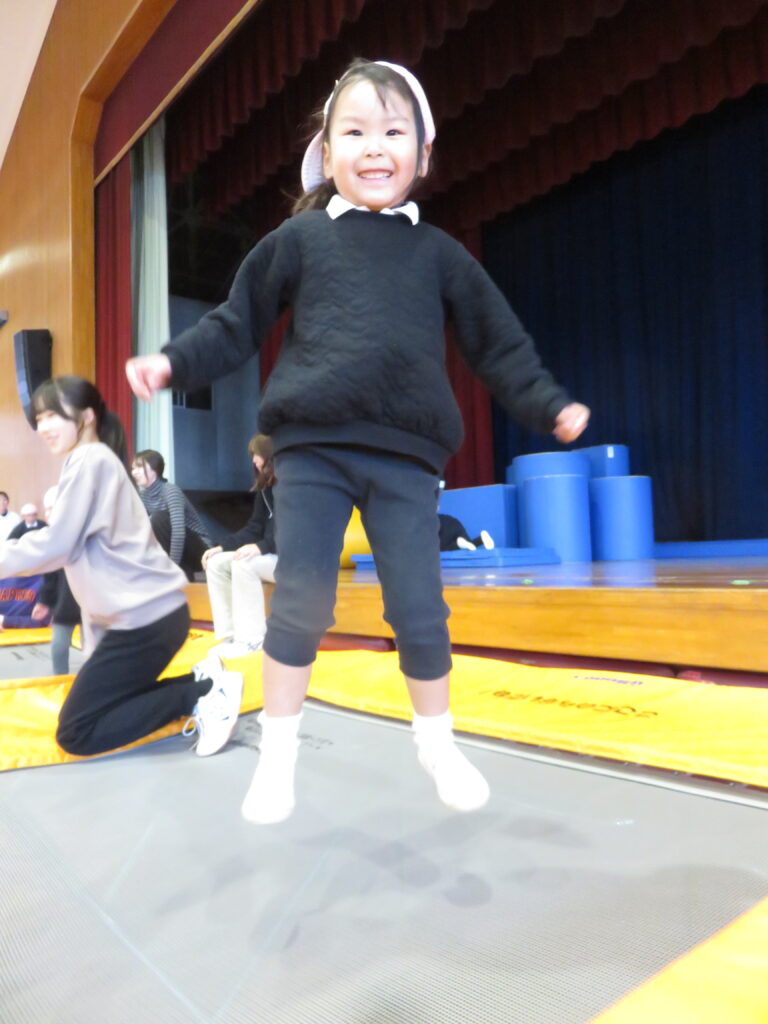 トランポリンはお友達と一緒に色々な跳び方をしました。高く跳んでみたり、お友達と息を合わせて一緒に跳んでみたりと、笑いながら楽しそうに跳んでいる姿が印象的でした♪
