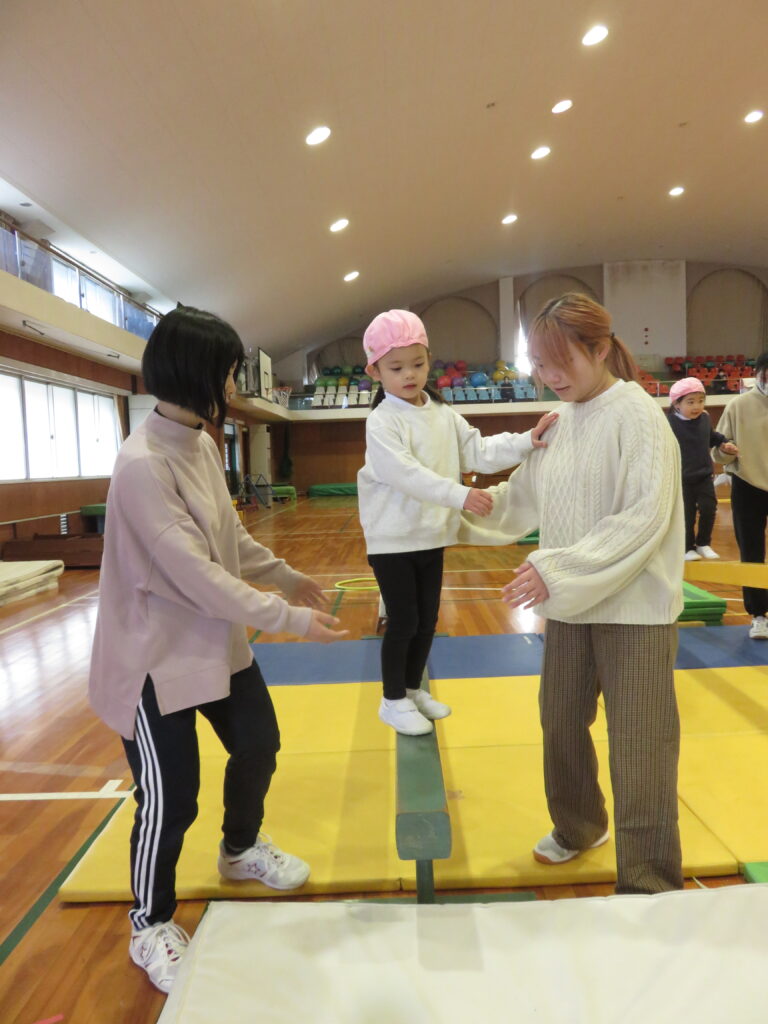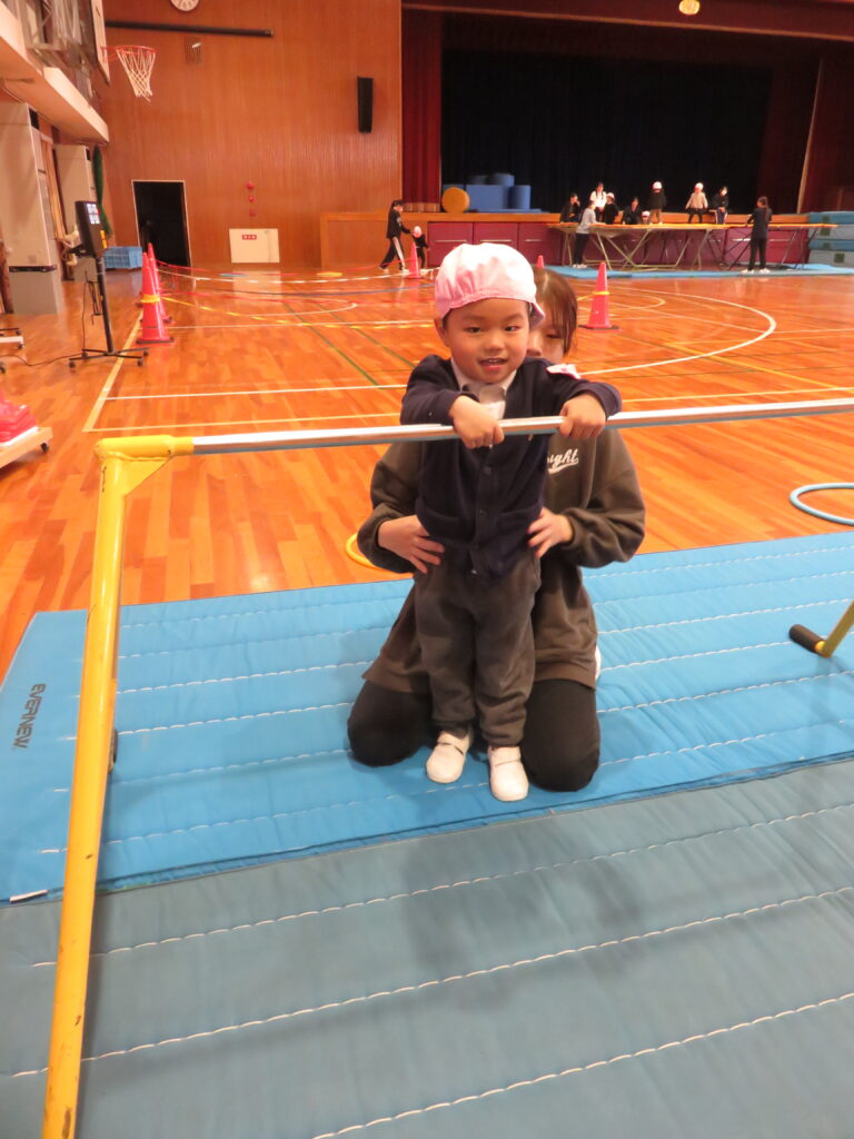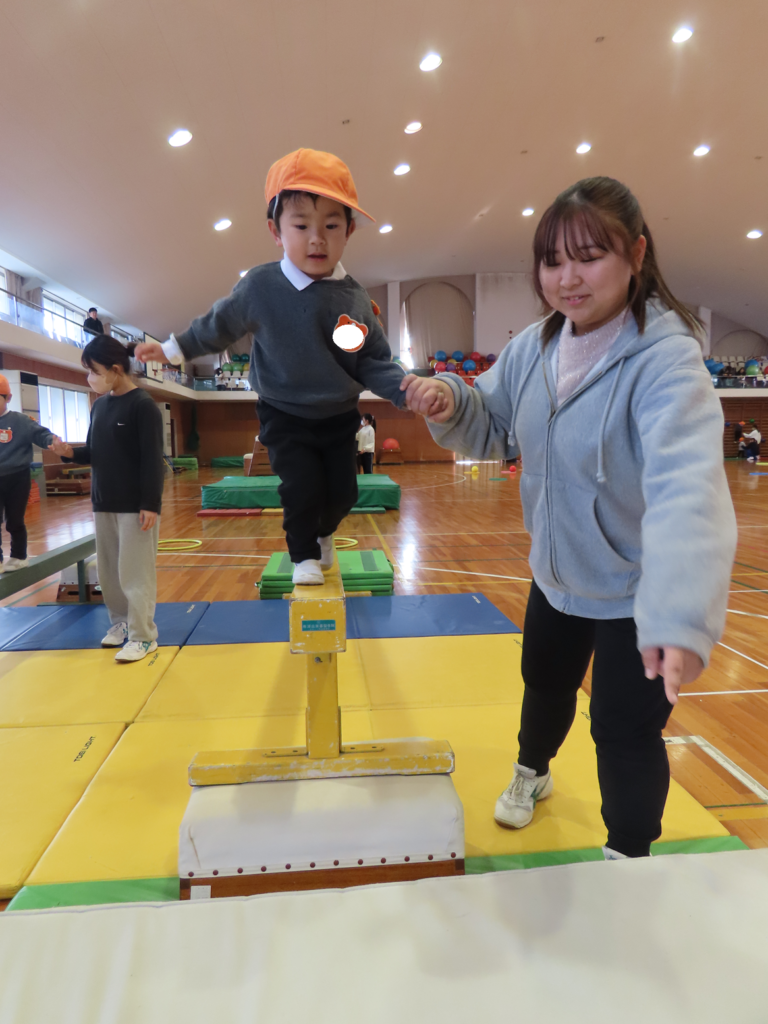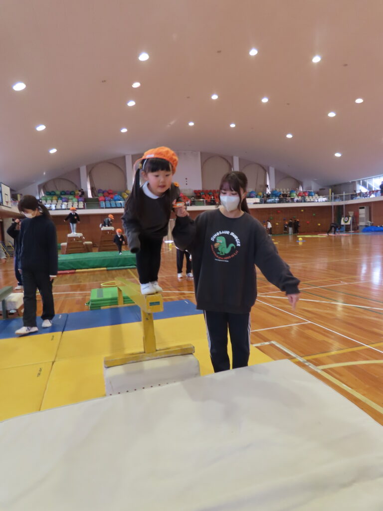 いつもはお姉さんと手を繋いで挑戦している子どもたちですが、今日は一人で挑戦してみよう!ということで、様々な運動遊びに一人で挑戦しました。細い平均台をそーっと渡ったり、子どもたちの背よりも高い跳び箱を渡ったり、、、!